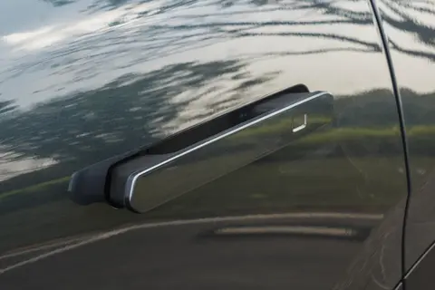 侧面采用隐藏式水切、悬浮车顶与一体式纯平侧窗设计, A 柱延伸至机盖下沿,视觉流畅。隐藏式门把手在降低风阻的同时,也让侧面更加简洁。21英寸轮毂尺寸恰到好处,既撑得起车身比例,又不会因为薄胎而牺牲舒适性。搭配橙色前4活塞卡钳,轮胎规格为285/45 R21。激光雷达集成于后视镜,兼顾空气动力学与高级感。尾部简洁大气,一大亮点为全系标配的"天地门"电动对开尾门,上下双开结构可承重300kg,拓展露营、钓鱼等户外场景需求,兼具实用性与情绪价值。上段尾门集成贯穿式智慧灯带,支持与车头呼应的自定义灯语。车顶配备镂空式扰流板,内嵌高位刹车灯,后保险杠加入扩散器造型强化运动感。整车风阻系数低至0.25Cd,采用无边框后视镜、隐藏门把手等设计优化气流,提升静谧性与续航表现。我最喜欢的是一个小细节:后窗玻璃的倾角比多数大型SUV都要大,这让第三排乘客的视野更加开阔,减少了压抑感。提供5款专属车色:极夜黑(主打色)、云晞灰、曜日银、晨晖蓝、拂晓白,云晞灰实车在光影下呈现金属颗粒质感。总体来说,领克900的外观在旗舰气场和家庭温情之间找到了很好的平衡。它不会像某些豪华品牌SUV那样显得过于商务,也不会像一些新势力车型那样过于前卫。这种“刚刚好”的审美,可能正是它能吸引不同年龄段家庭用户的原因。