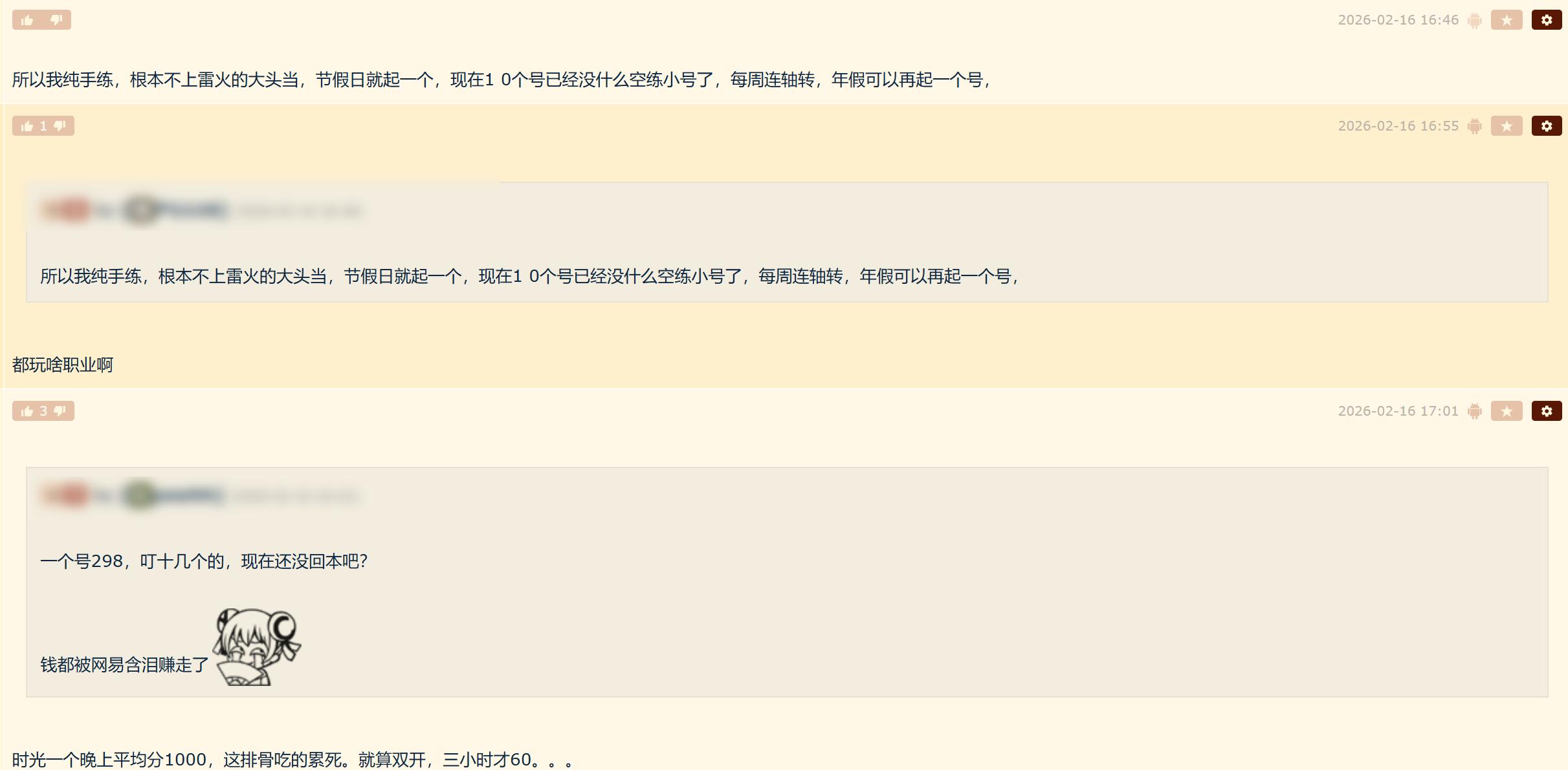 而评论区也有一个玩家直接表示,说自己是纯手练,根本不会上雷火的当,节假日就起一个号,现在已经有 10 个了,并且表示自己没有什么时间去练小号了。不过该玩家还说有空的时候可以再起一个号,而这个回应完全打脸了帖主说的时光服依靠叮号礼包去起号。如果真的依靠叮号礼包的话,那么魔兽世界时光服不会有那么多排骨人。