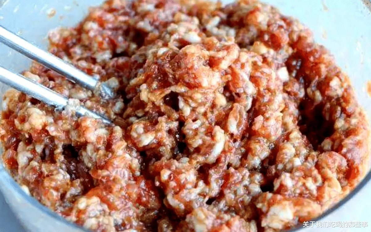 第三,不管加什么进肉馅,都是先抓均,再朝着一个方向搅拌至粘稠。