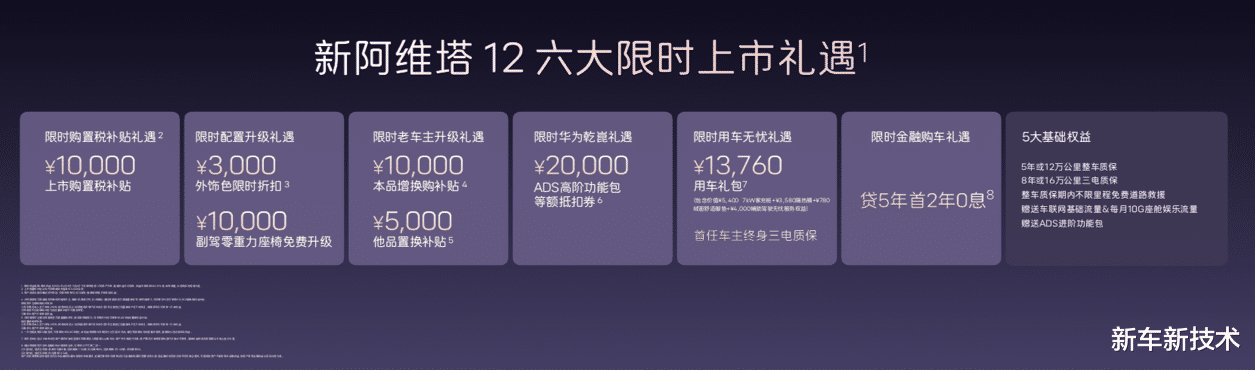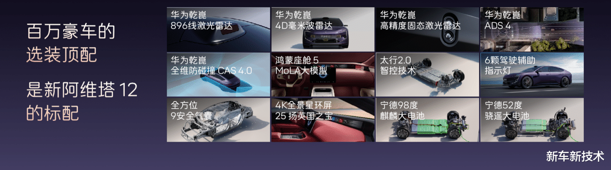 新阿维塔12定位未来智能豪华轿车,面向时代精英人群,主打豪华、智能、旗舰级出行体验。新车全系标配12项顶格配置,涵盖华为乾崑智驾全系统、太行智控2.0、35.4英寸4K全景星环屏、25扬英国之宝音响、全车9安全气囊等,百万豪车顶配选装功能悉数标配。同时推出六大限时购车礼遇,购置税补贴礼遇、配置升级礼遇、老车主升级礼遇、ADS高阶包抵扣权益、贷5年首2年0息金融礼遇、万元用车无忧礼遇,入门即满配,彻底打破豪华门槛。