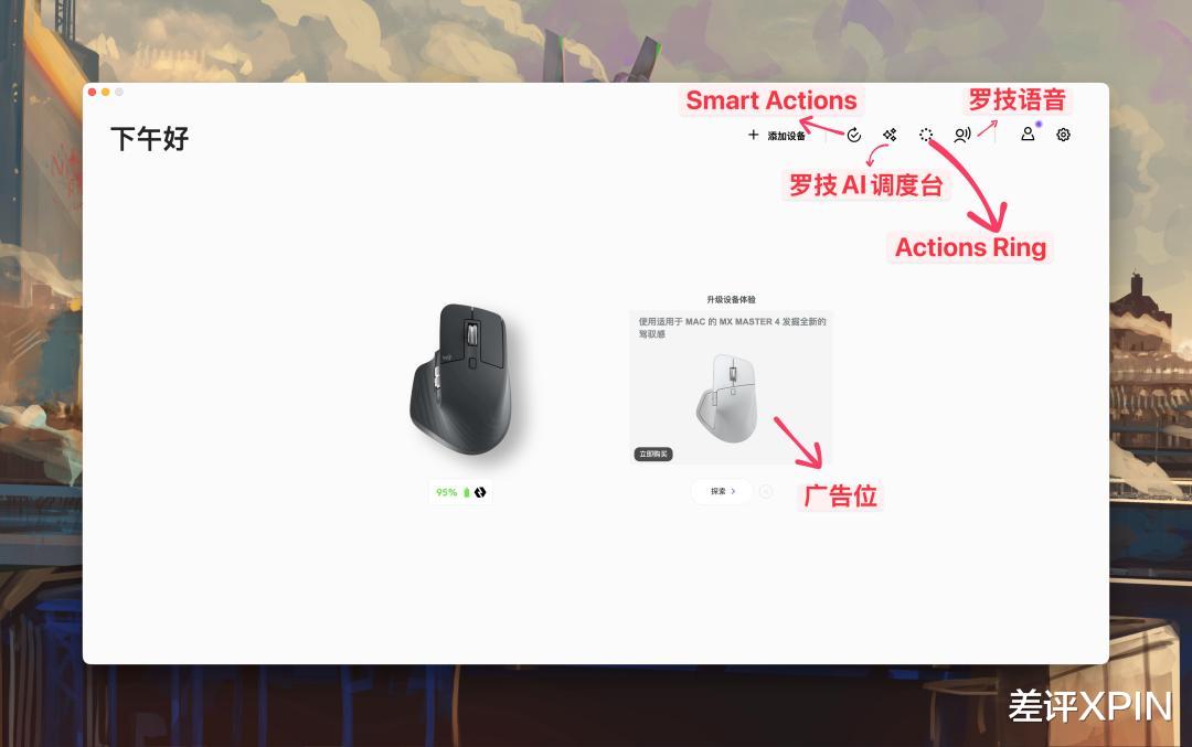 广告位、罗技语音、罗技 AI 调度台、Actions Ring、Smart Actions 塞得满满当当。