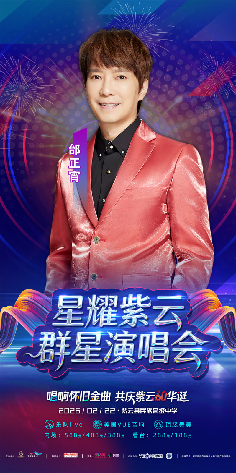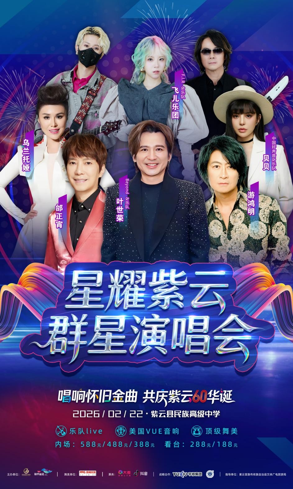 当摇滚的热血碰撞柔情的旋律,当回忆的青春遇见都市的浪漫,2026年2月22日,“星耀紫云群星演唱会”将在贵州紫云民族高级中学震撼启幕!叶世荣、邰正宵、游鸿明、乌兰托娅、飞儿乐团、贝贝六组实力唱将联袂登场,用音乐编织一场跨越时代的视听狂欢。这场演唱会不仅是紫云县建县60周年的的压轴大戏,更是一场献给所有音乐爱好者的新年礼物!