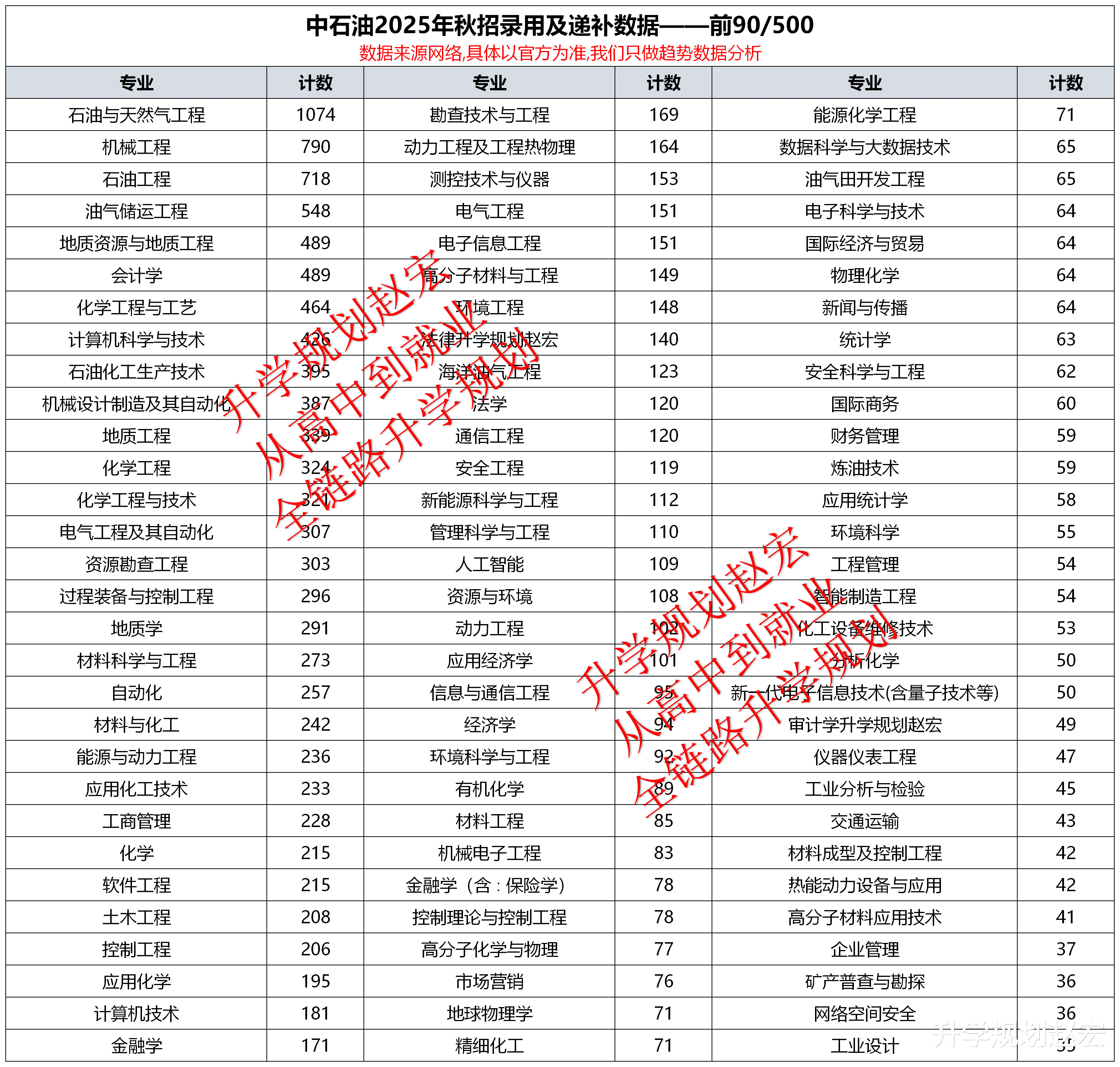 这儿做一个说明,要不大家容易弄混,2025年秋招数据,是2026年度在2025年的秋季招录,但实际上是为了2026年度的招录。中石油招录文件上写的是2025年秋招,中石化的文件写的就是2026年度。不管写2025年秋招还是2026年校招,大家看到的都是2026年度的,如果想要往这个方向的,一定要提前准备,每年秋季都有考试。接下来还有春招,春招的人数要少很多。这儿啰嗦了一下,我们的内容都会直接2026来区分。另外数据是软件加工处理,会有一定的误差,但不影响咱们整体趋势的判断,同时我们会把拟录用和递补一起来看,目的是看哪些院校和专业机会更多,因为名单是结果。