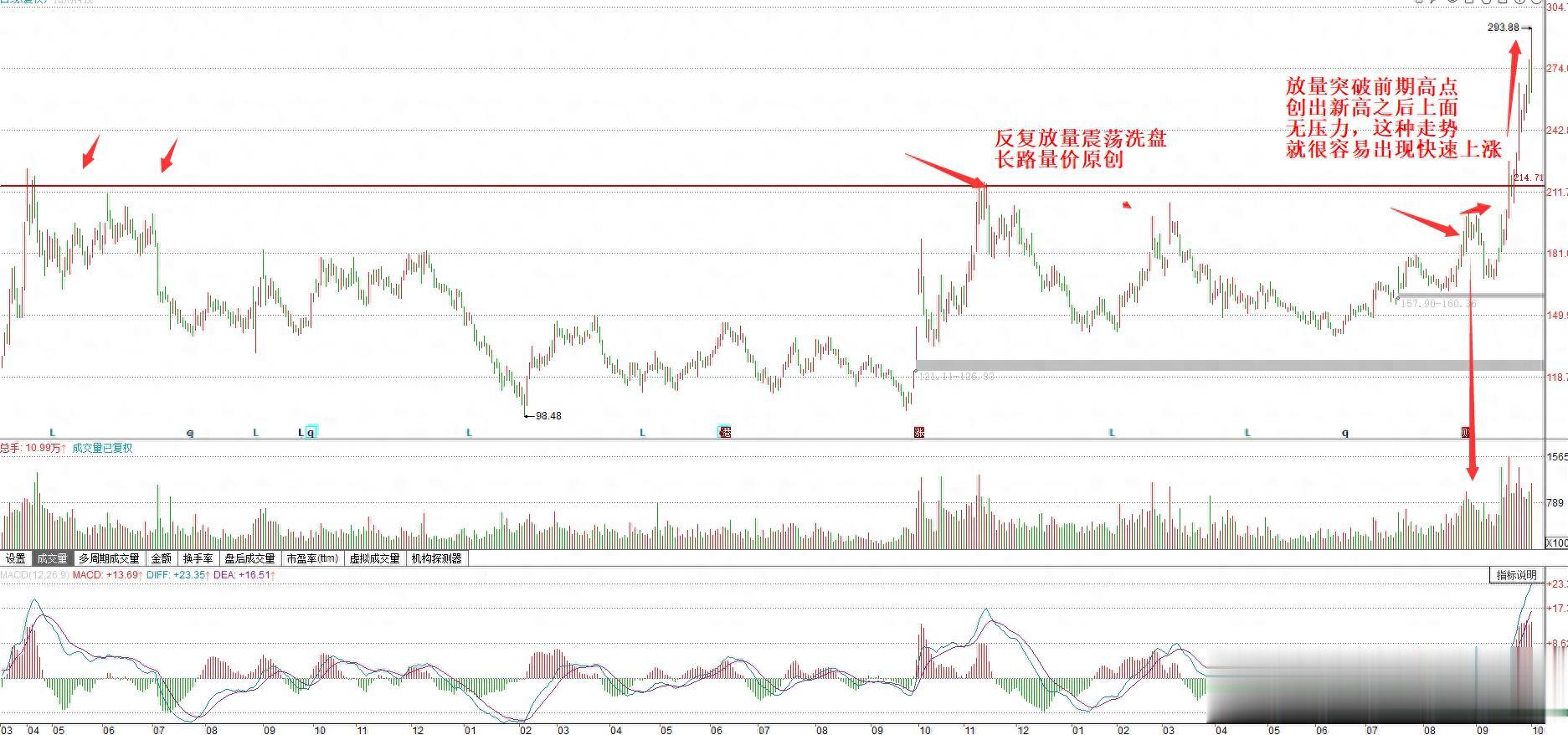 这就是提到了在股市中是不能一根筋的,一般只要是拉起来就放量震荡,后面就跟着回调,这种位置肯定是大资金高抛了,但是就是这种位置如果在反复震荡之后,后面没有下跌回调,而是开始走出突破的走势。