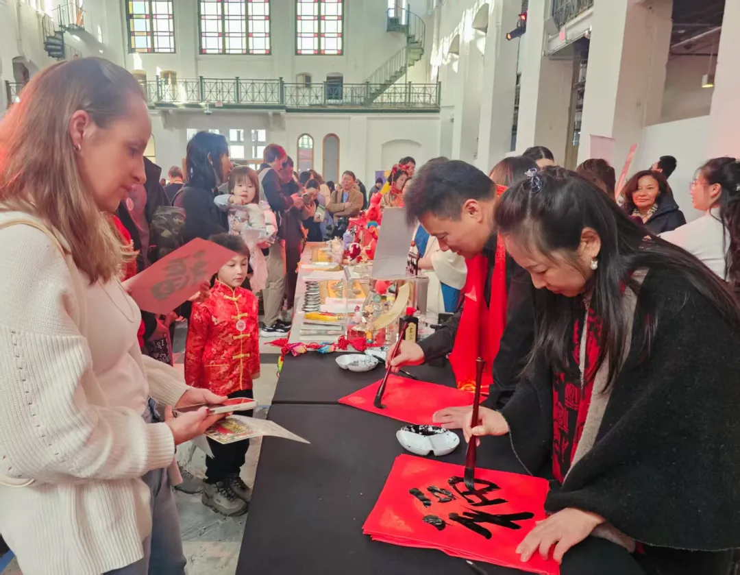 活动现场暖意融融、翰墨飘香。艺术家翟优、樊蕾与小书法家翟悦涵现场挥毫泼墨,精心书写“福”字、“马上有福”“马上有钱”等饱含新春寓意与马年吉祥祝福的书法作品,免费赠予到场的美国民众。红纸衬墨色,福韵传温情,当地民众有序排队、热情参与,手持墨宝驻足合影,沉浸式体验中国传统年俗与书法艺术的独特魅力,现场洋溢着欢乐祥和的新春氛围。