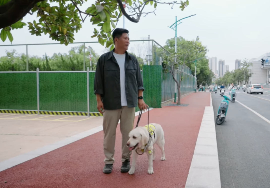 来源:纪录片《触得到的远方》,宝哥和导盲犬阿尔法走在路上