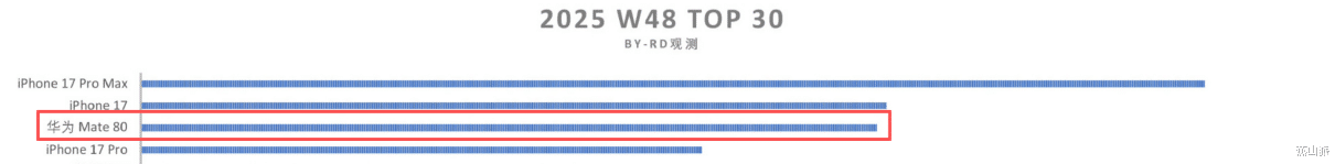 近日,一则由科技数码媒体分享的2025年第48周国内手机销量榜单,引发了业界广泛关注。数据显示,华为Mate 80数字版在该榜单上位列第三,意义非凡。要知道,自9月以来,苹果iPhone 17系列几乎以“铁三角”之势牢牢霸占榜单前三名,构筑起一道看似坚不可摧的壁垒,而此次华为Mate 80系列一经开售便强势破局,一举终结了苹果长时间独占国内销量榜单前三的局面。并且自华为Mate 80系列发布以来,华为手机国内市场份额连续2周超越苹果,重夺国内市场份额第一。