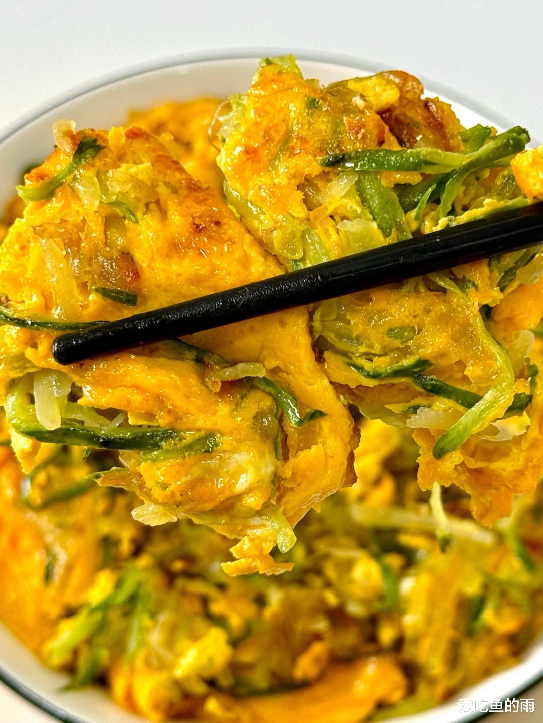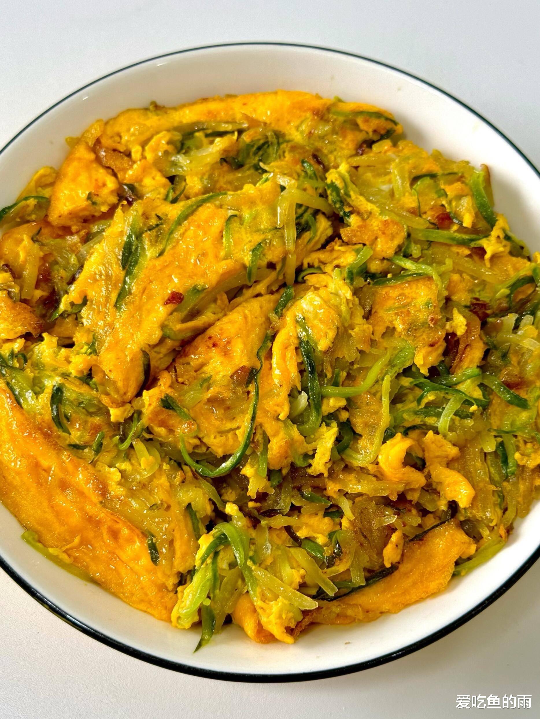 关火前的一勺香油,是点睛的神来之笔。晶莹油珠“噼啪”滚入锅,香气“轰”地窜起,直往鼻尖钻!装盘的白瓷碗里,黄的鸡蛋、绿的黄瓜、白的土豆丝,油亮亮地挤作一堆,活像一副热闹的工笔画。十几岁第一次学炒这道菜,锅铲比书包还沉。外婆在灶后笑:“铁锅认人哩,土豆丝要像春蚕吐丝那么顺溜!” 我笨手笨脚搅得碎渣满天飞,她却把那盘稀碎的“鸡蛋炒渣”吃个精光:“不糊不焦就有六十分!”