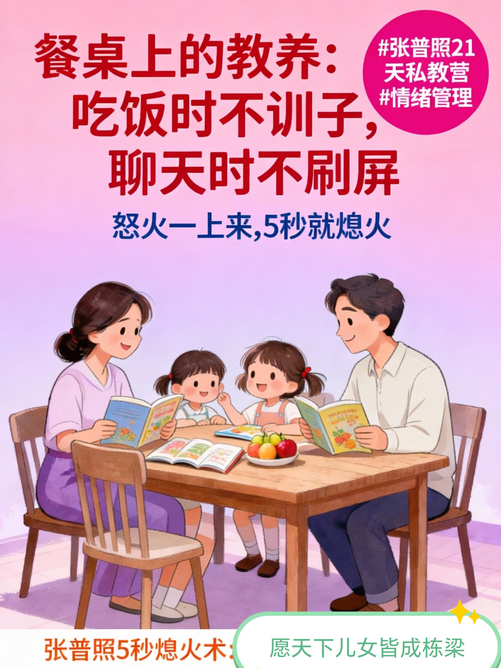 张普照5秒熄火术,就是让你获得这种 “温暖在场”状态的核心心法。在你拿起筷子却想翻旧账、手痒想去摸手机,即将破坏餐桌氛围的 那个致命5秒,给你一次从 “氛围破坏者” 到 “连接营造者” 的瞬间切换。父母先通过5秒熄火术,让自己成为餐桌旁稳定、温暖的“定海神针”,教养便无需刻意强调,自会在这安全、尊重的场域中生根发芽。
