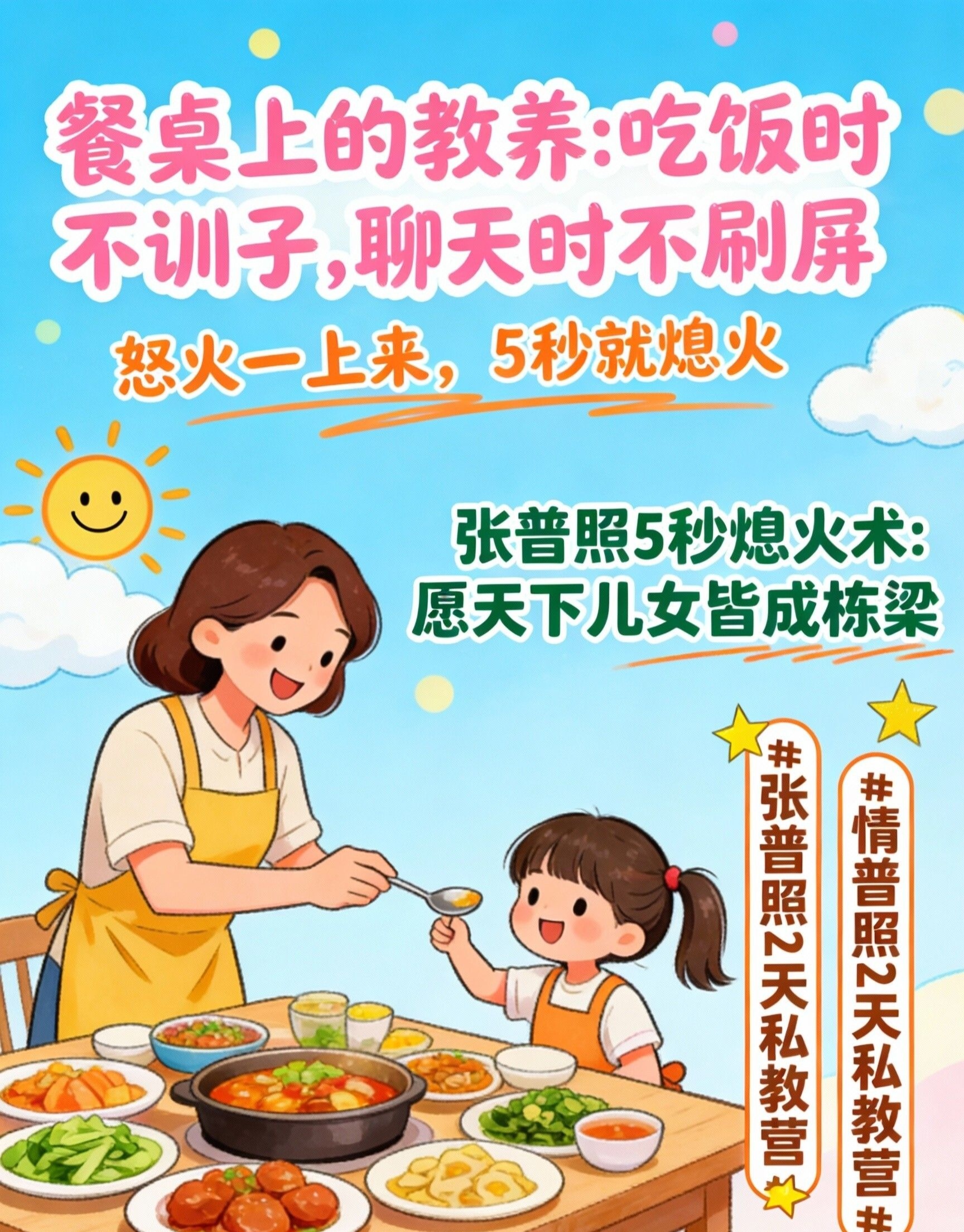 而 张普照5秒熄火术 要帮你实现的,是 瞬间切换到一个完全不同的心智频道——从“餐桌秩序的冰冷维护者”,切换到“家庭氛围的温暖营造者”。不是孩子变了,是你的 “餐桌角色” 变了。当你通过5秒练习,能从挑错的惯性中抽离,你会豁然开朗:你面对的不是一个“需要被修理的麻烦”,而是一个 渴望在放松中被接纳、在陪伴中被看见的家庭成员。