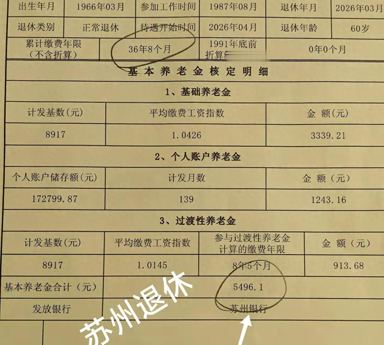这位友友的养老金在我看来还不错。单价工龄达到了每年149元以上。如果这位友友的缴费基数能达到社平工资的1.5倍及以上,养老金至少在6500元以上。不过5496.1元只是预发养老金,但愿正式养老金能达到5600元以上,期待2026年江苏计发基数能高一些。恭喜这位友友光荣退休。