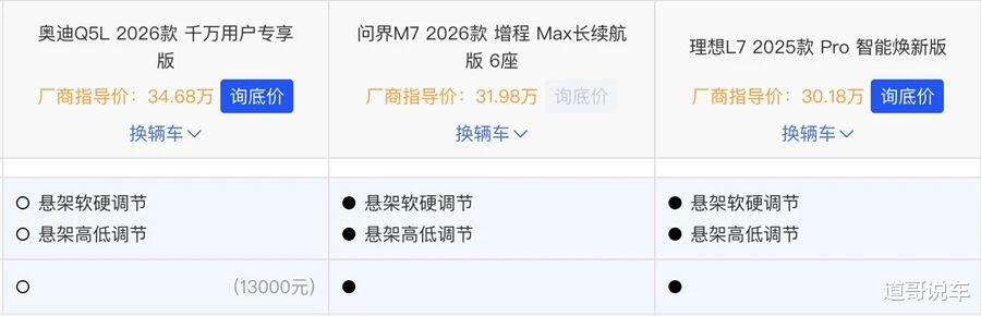 在这个“智驾入场即标配”的2026年,30万级别的SUV如果不带激光雷达、不带城区NOA,几乎等同于“裸奔”。问界M7全系标配智驾,理想L7起步即智能,奥迪却依然玩着“基础功能免费,核心功能收钱”的老牌合资套路。