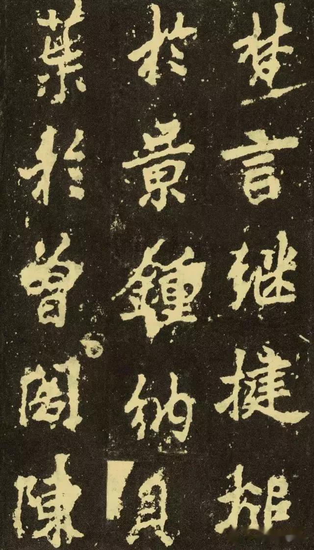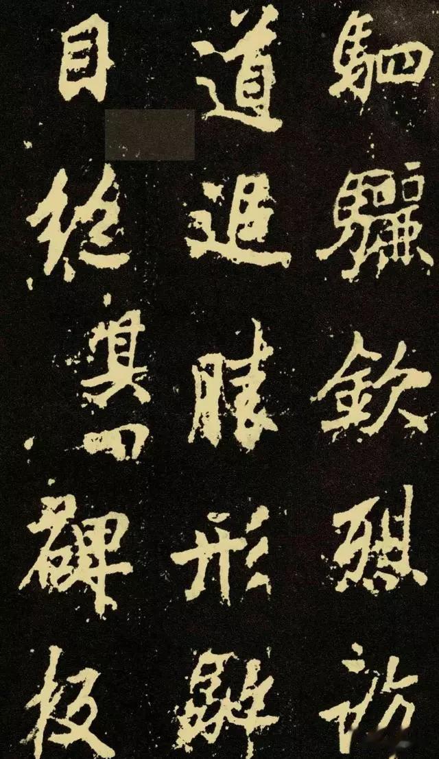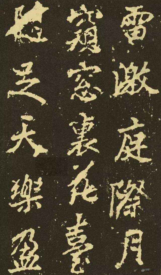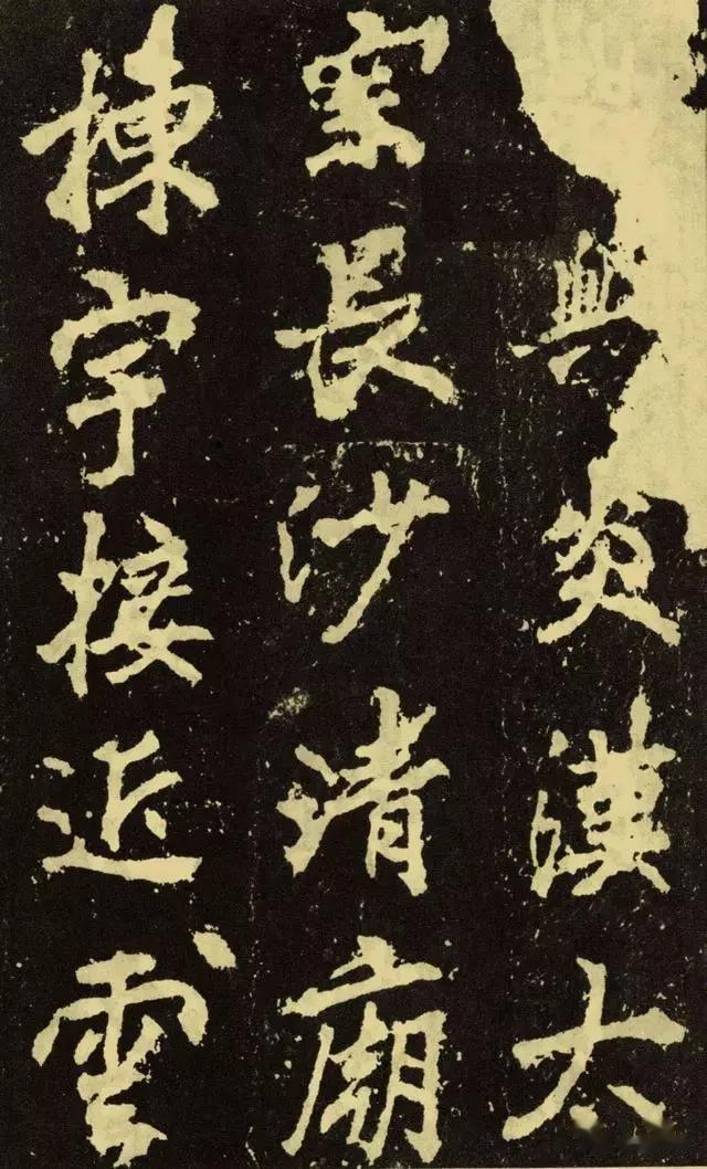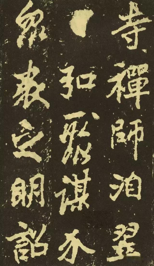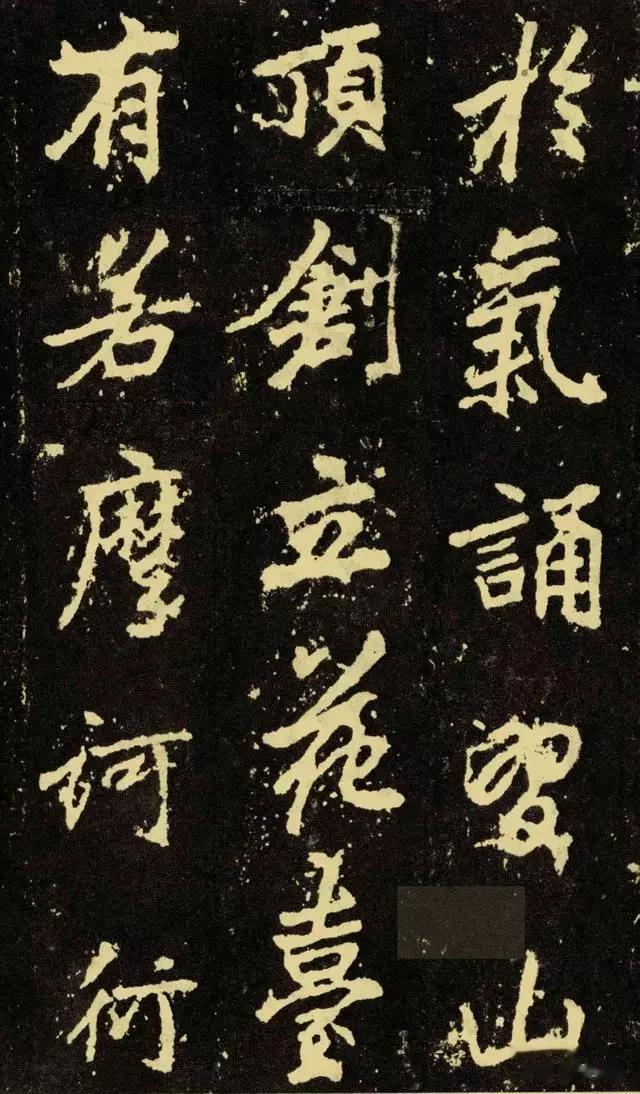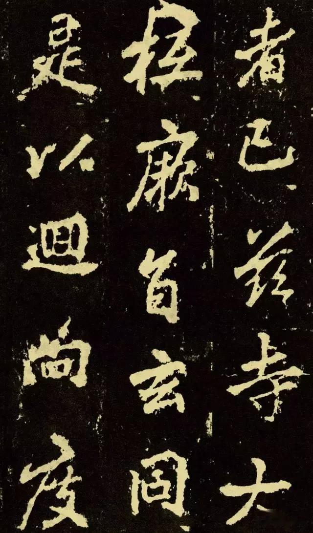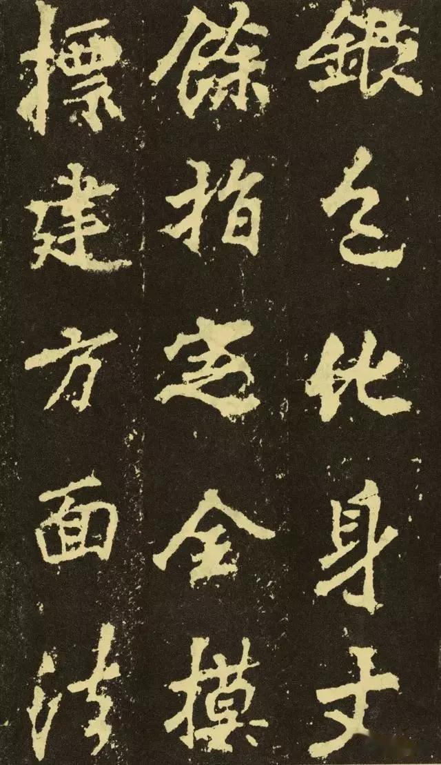 《麓山寺碑》属李邕晚年之作,其书风渐趋成熟,全篇笔力苍健雄厚,结体开张,中宫紧缩,而每个字的笔画都似有向外扩张的力量。刘熙载在《书概》中评曰:『北海书气体高异,所难尤在一点二画,皆如抛砖落地,使人不敢以虚骄之意拟之。』在结字上峻峭欹侧,险中取胜,错落参差,奇崛多变,或正斜,或伸缩,或静动,或疏密,呈现出生动多姿、跌宕有致的意趣。
