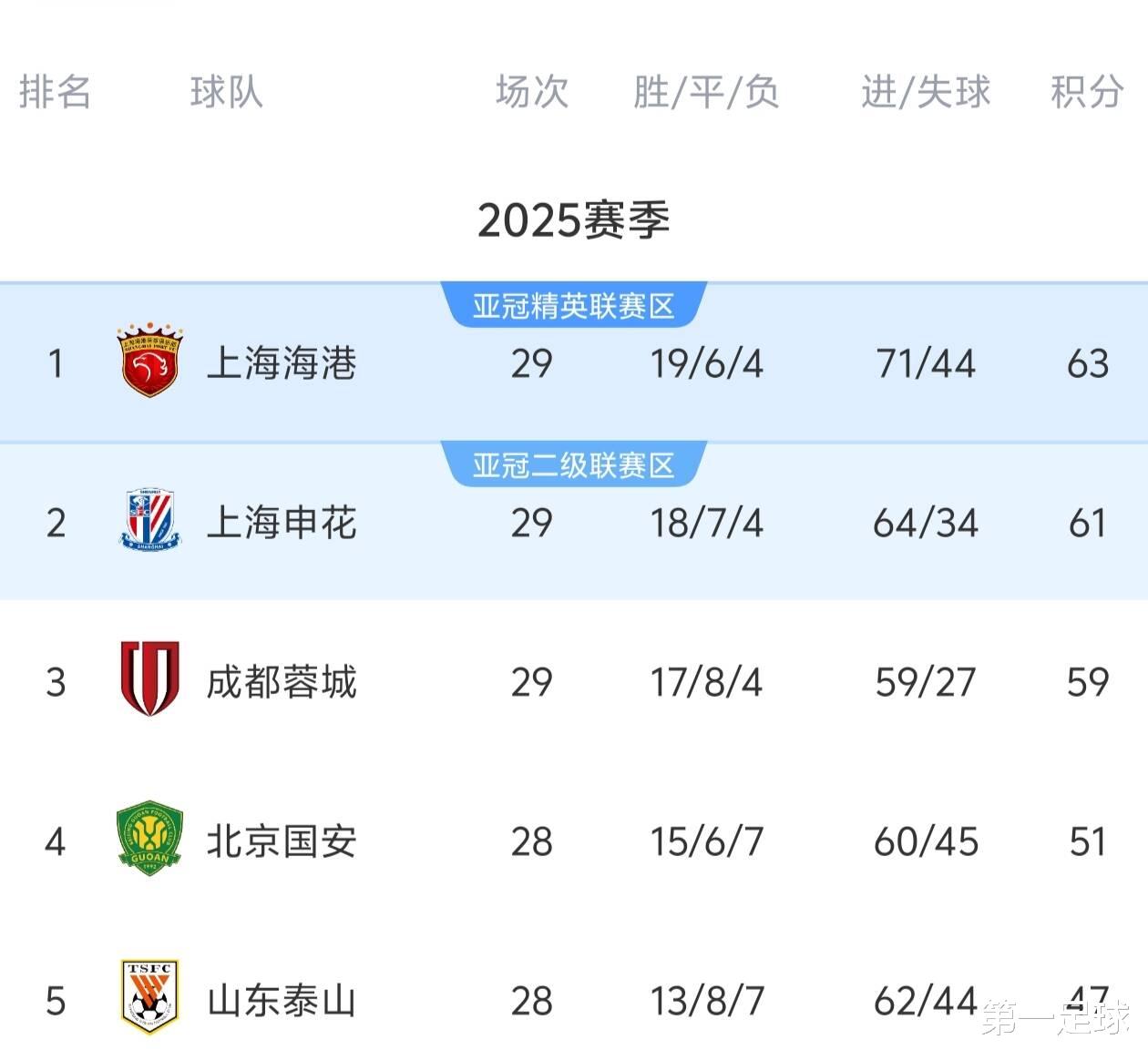 最新积分榜上,上海海港积63分排名第一,上海申花积61分排名第二,成都蓉城积59分排名第三,联赛还剩最后一轮,成都蓉城退出争冠,和上赛季,最重要冠军归属还是由上海双雄来竞争。不过,种种迹象表明,上海申花基本是死缓了。