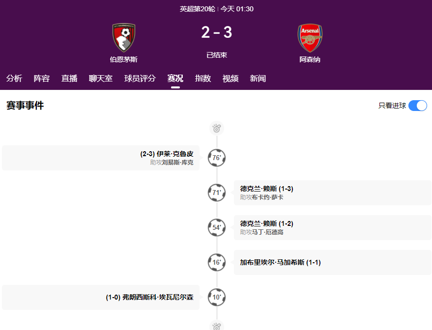 上半场加布里埃尔送礼,埃瓦尼尔森破门,随后加布里埃尔补射破门将功补过扳平比分,阿森纳暂1-1伯恩茅斯;下半场厄德高助攻赖斯破门帮助枪手反超比分,随后萨卡助攻赖斯再下一城,克鲁皮为伯恩茅斯扳回一球。