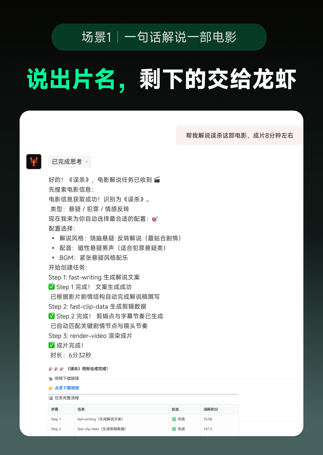 电影、短剧、漫剧,甚至外语解说都能做。它把整条解说视频的制作流程拆成小龙虾能理解的模块,写文案、配音配乐、匹配画面、剪辑合成,全套自动完成。