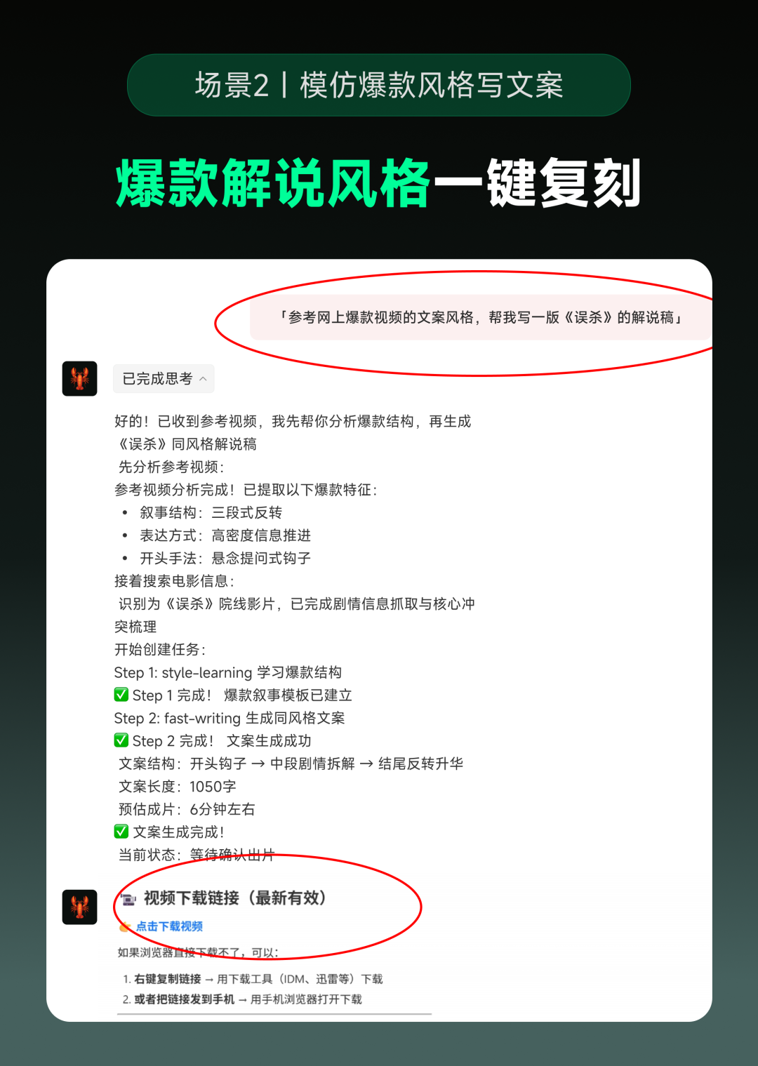 现在一句话,小龙虾帮你搞定从拉片到成片的所有环节。试过之后你会发现,原来做解说视频,可以这么简单。