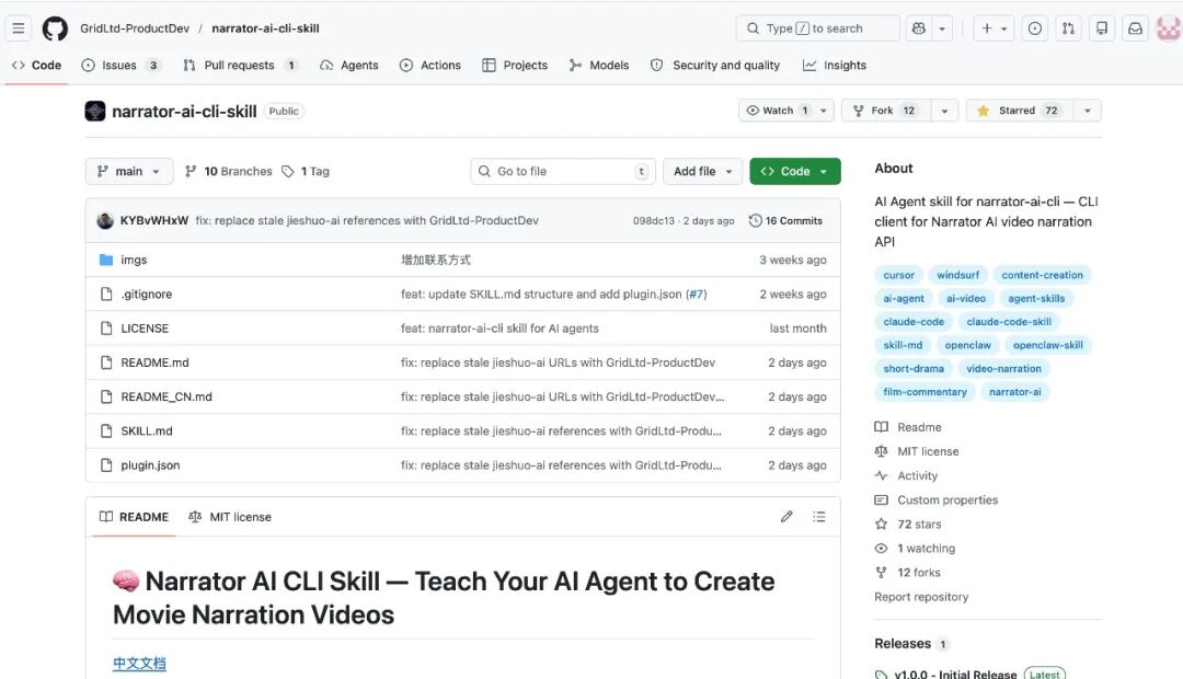 直到我发现了这个 Narrator AI Skill。它把之前那一套需要人工一步一步推的流程全都规整在了一起,之前要自己动手的环节基本都可以替代。这个 Skill 是 AI解说大师(小龙虾) 开源出来的技能包,配合 Agent 平台(也就是我一直在说的小龙虾)一起用,整条解说视频的生产线就跑起来了。