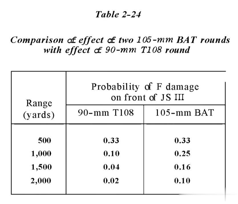 下表摘自《军械工程设计手册 - 火炮弹药系列 - 第2节:终端效应设计》,展示了使用 106 毫米 M40 无后坐力炮(配用校准枪瞄准)对静止的 IS-3 坦克进行两发齐射时的火力毁伤概率。如表所示,即便在 500 米的近距离下且进行了两次瞄准射击,大口径无后坐力炮造成火力毁伤的概率也仅有 1/3(33%)。该武器的最大有效射程——即至少有 50% 的火力毁伤概率——或许仅在 200 到 300 米左右,这与标注的 1,350 米最大有效射程相去甚远(后者仅仅是最大直射射程)。如果按照苏联关于“55% 毁伤概率”的定义标准,其实际有效射程可能不足 200 米。