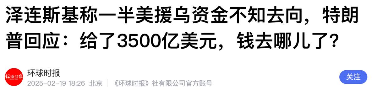 《环球时报》:泽连斯基称一半美援乌资金不知去向,特朗普回应:给了3500亿美元,钱去哪儿了?