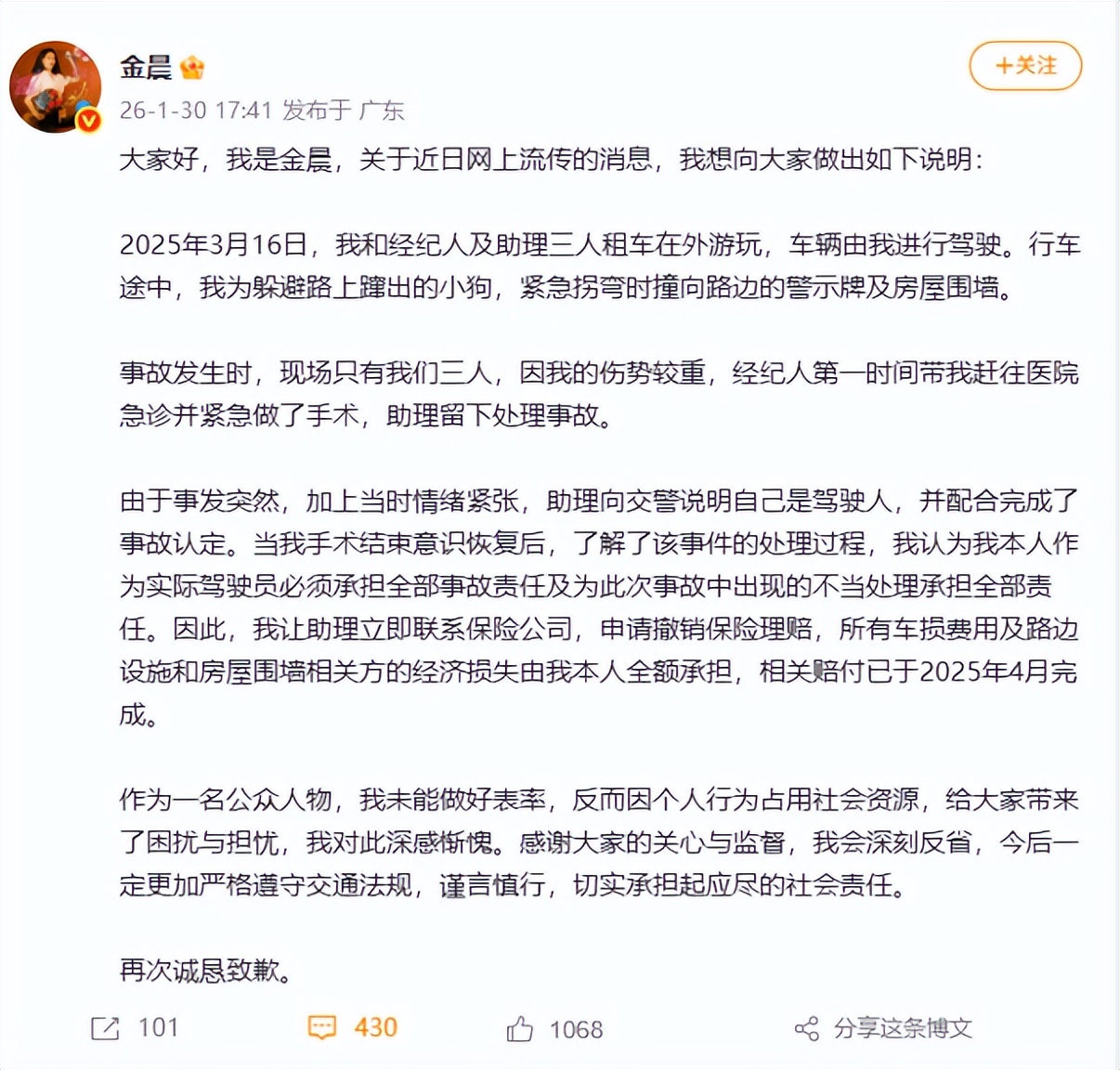 据网友发文披露,有知情人士称,事发时实际驾驶人为金晨本人,其助理徐长青当时坐在后座。事故发生后,金晨与经纪人随即离开现场,留下助理徐长青处理后续事宜并应对交警调查。在事故处理结束后,保险公司在理赔调查阶段调取交警监控时发现,实际驾驶人并非徐长青,而是车主金晨本人,保险公司随后向交警部门报案。据悉,金晨方面曾联系保险公司要求撤案,保险公司经考虑后撤销了该报案。