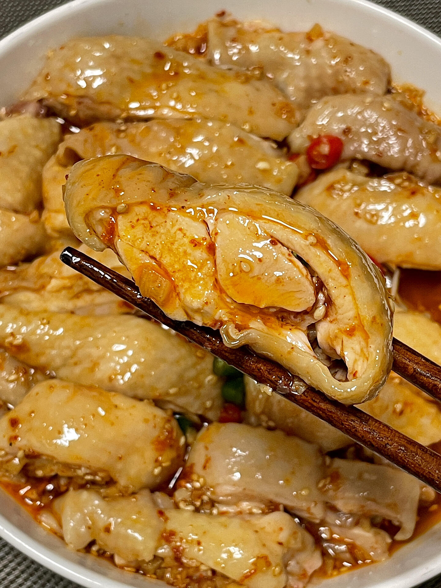 端上桌,麻辣的香味直往鼻子里钻。夹一块鸡肉送进嘴里,第一感觉是嫩——鸡腿肉煮得恰到好处,又泡过凉水,肉质嫩滑不柴,轻轻一抿就化开;鸡皮爽脆Q弹,咬下去微微弹牙。接着是麻辣,红油的香辣和花椒的麻在舌尖散开,恰到好处地刺激着味蕾,不会太冲也不会太淡。金针菇吸饱了料汁,脆爽入味,咯吱咯吱的,和鸡肉一起吃,口感特别丰富。最后是回味里的鲜甜,生抽和蚝油的咸鲜,白糖的柔和,全都在嘴里化开。