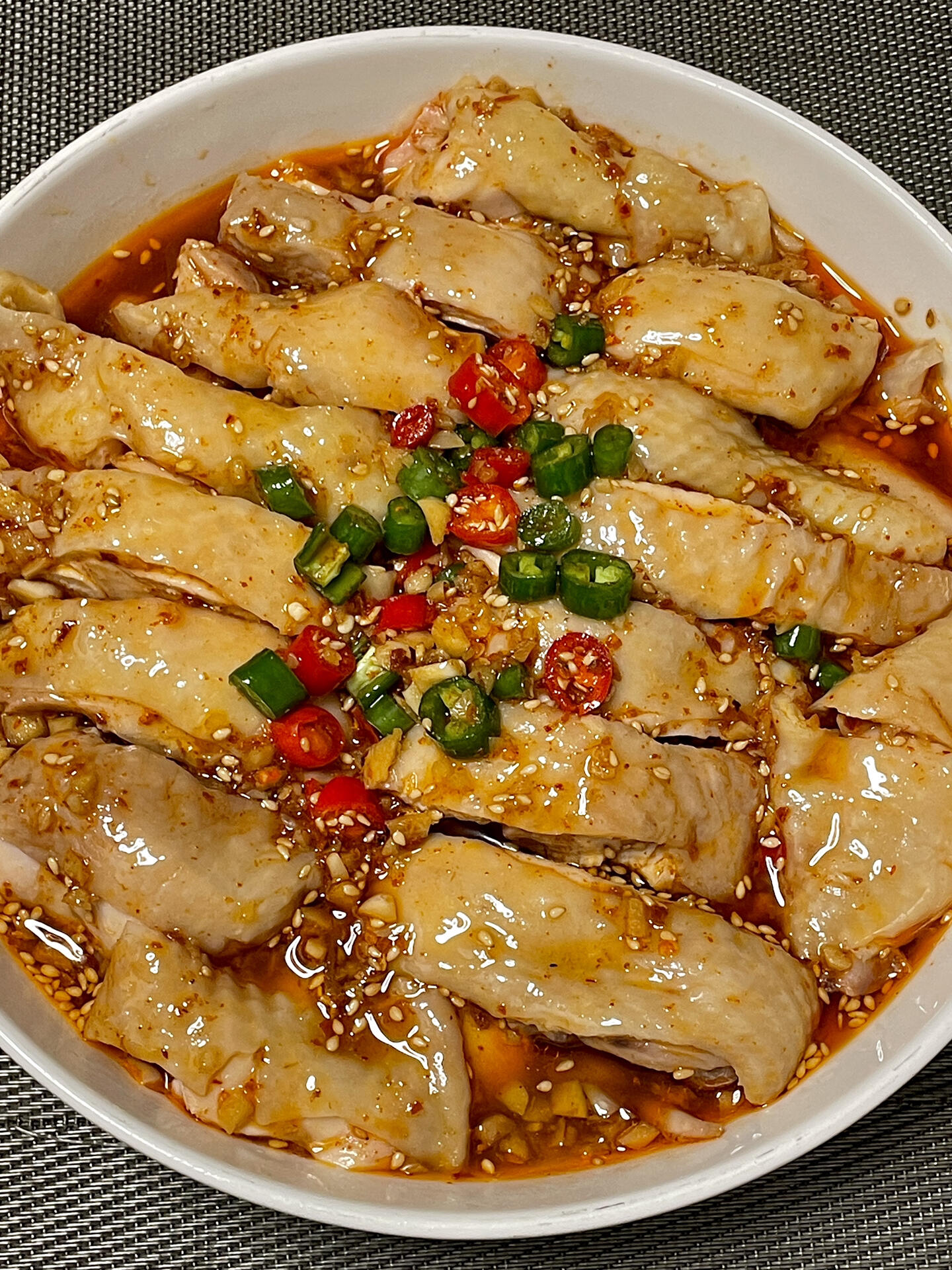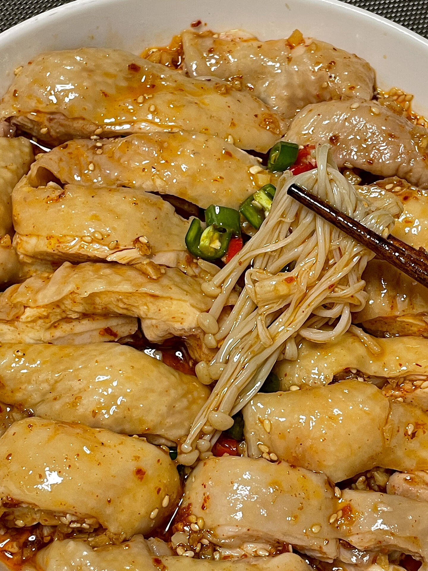 鸡腿凉透了,从水里捞出来,去骨后切成小块,整齐地码在金针菇上。切好的鸡腿肉白白嫩嫩的,皮肉分明,看着就让人有食欲。最后撒上青红辣椒圈,再把调好的红油料汁均匀淋上去,料汁慢慢渗进鸡肉和金针菇里,红油的颜色也染红了整道菜,红亮亮的特别诱人。