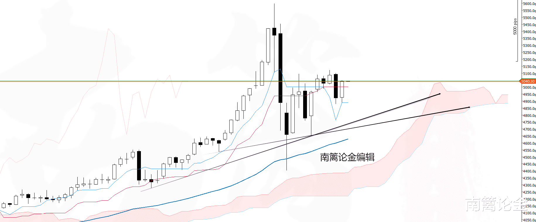 虽说周五的收盘稳定在5040,但整体没有超出上周的高位,由于基本面的事件,周一并不排除跳空高开的概率。故而下周最关键的还是前高一代的得失,从5597拉至4403的斐波那契61.8%的位置持续是在5140,并不排除会有测试可能。