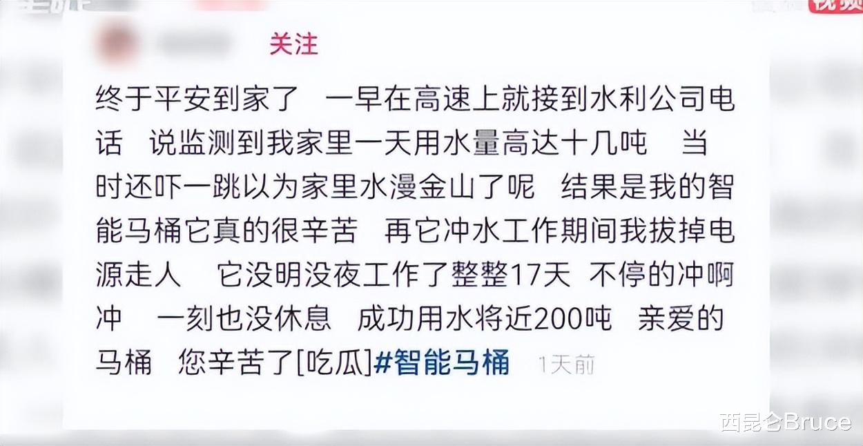 还有网友调侃:“智能马桶:主人让我‘冲’,我就一直‘冲’,没毛病啊。”也有人表示后怕:“看完这个,我决定以后出远门不光关电源,还得关总水阀。”
