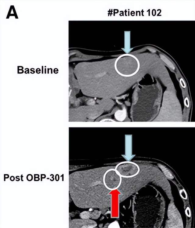 OBP-301不仅在食管癌具有治疗潜力,在肝癌治疗中同样产生一定的疗效。在2023年公布的一项OBP-301治疗难治性晚期肝癌的I 期临床试验中,一名49岁男性曾因门静脉肿瘤血栓和肺转移接受过14次经动脉化疗栓塞(TACE)、放射治疗以及索拉非尼治疗,但由于索拉非尼引发的治疗中出现的不良事件(TEAEs),他拒绝接受二线靶向治疗。在注射OBP-301后,该病灶显示出明确的坏死表现。