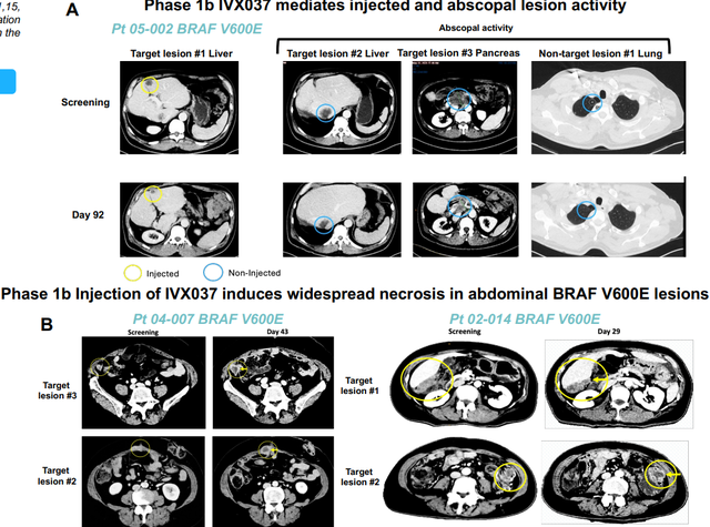 IVX037治疗在一些结直肠癌患者中显示出对肝脏、胰腺和肺部转移灶的显著控制效果,在BRAF V600E患者的腹部病变中诱导了快速且广泛的细胞坏死。
