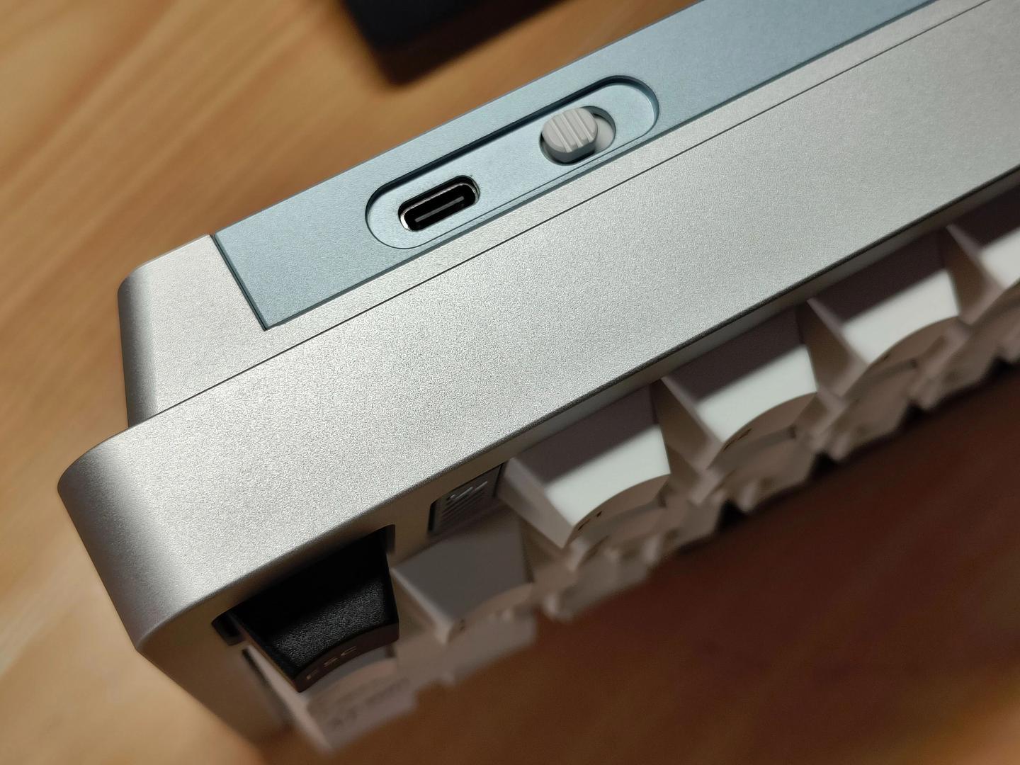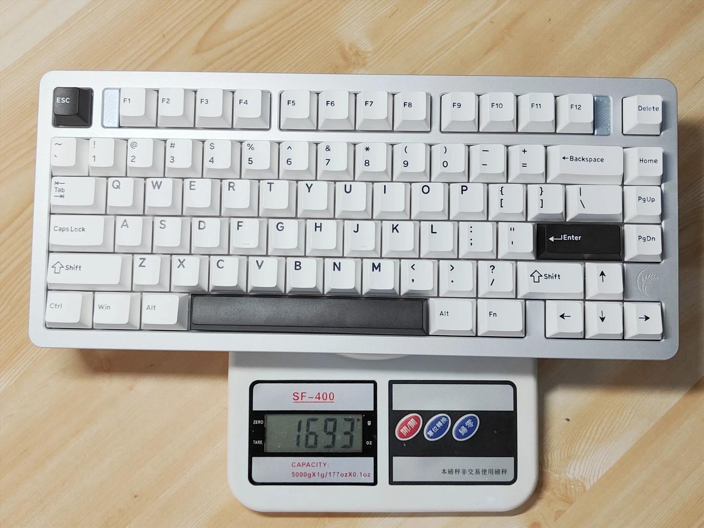 键盘到手第一感受,就是扎实。接近 1700g 的重量拿在手里沉甸甸的,没有半点虚浮感,毕竟是全系国标 6063 系铝的真铝坨坨,单纯质量就让人满意了。我选的是阳极银版本,180 目喷砂阳极氧化的工艺做得格外细腻,指尖划过外壳是温润爽滑的磨砂质感,摆在桌面上,光是看着就比普通塑料壳键盘高级了不止一个档次。