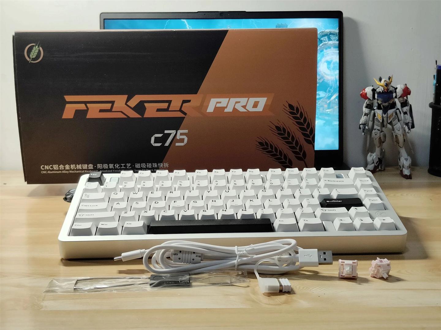 在最近的一年时间里,起码用过好几款75配列的机械键盘,作为客制化圈里最万金油的配列,75% 既能保留全功能按键,又能给桌面省下不少空间。但是一些接触过的键盘中,有的打着铝坨坨旗号的 “铝皮皮”,薄薄一层金属壳子手感很飘忽;要么是配置到位的 CNC 阳极款性价比难顶;更糟心的是不少热门款还要蹲点抢、等预售,花钱还难受。本来都快放弃找一把一步到位的 75 铝坨坨了,直到上手了 FEKER 这把刚出的 C75,才明白什么叫真正的 “卷到了核心”。