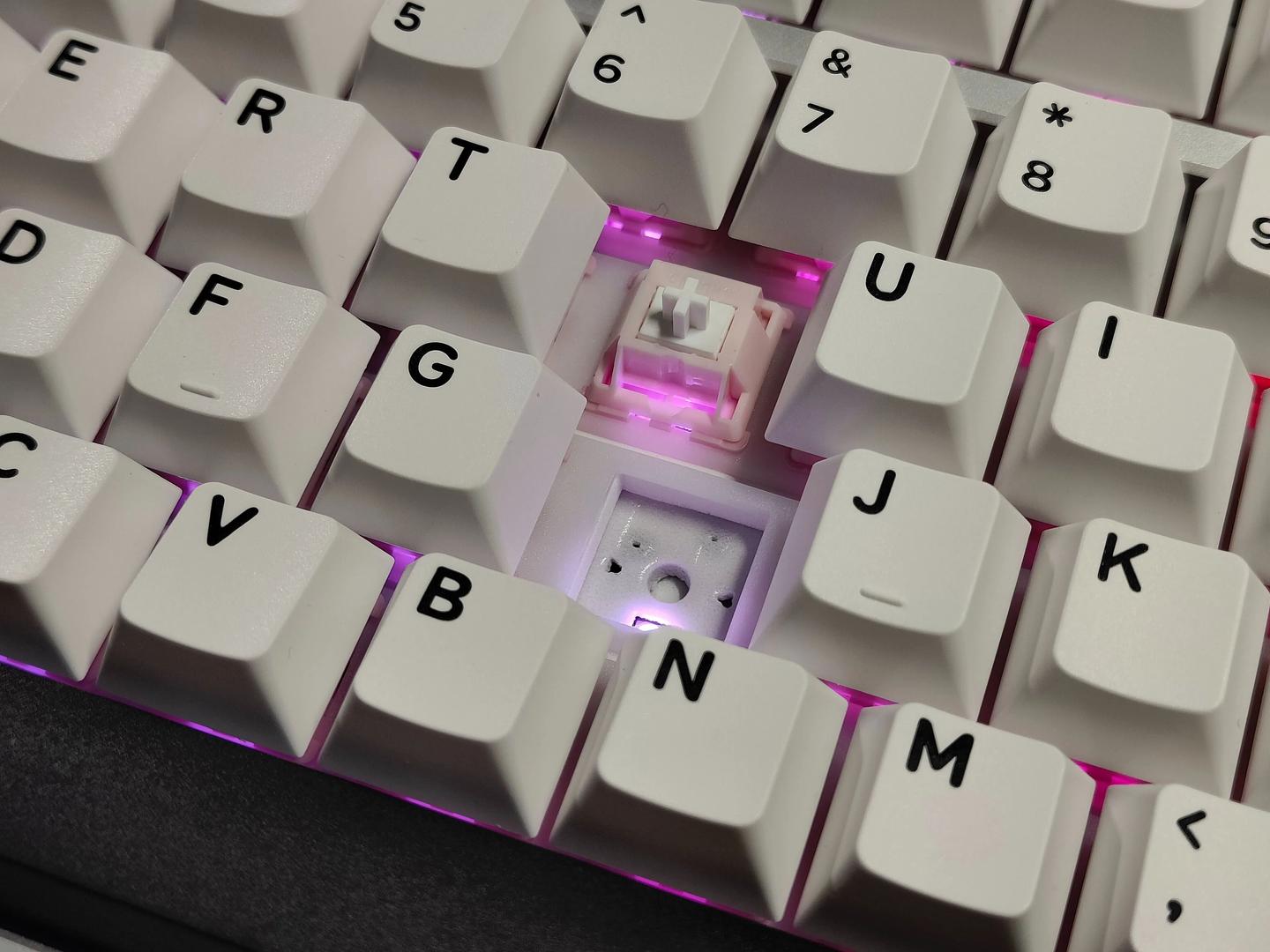 灯效方面,键盘用了下灯位的 RGB 幻彩背光设计,灯光均匀柔和不刺眼,配合原厂高度五面热升华PTB键帽,晚上用来玩游戏的时候,氛围感直接拉满。