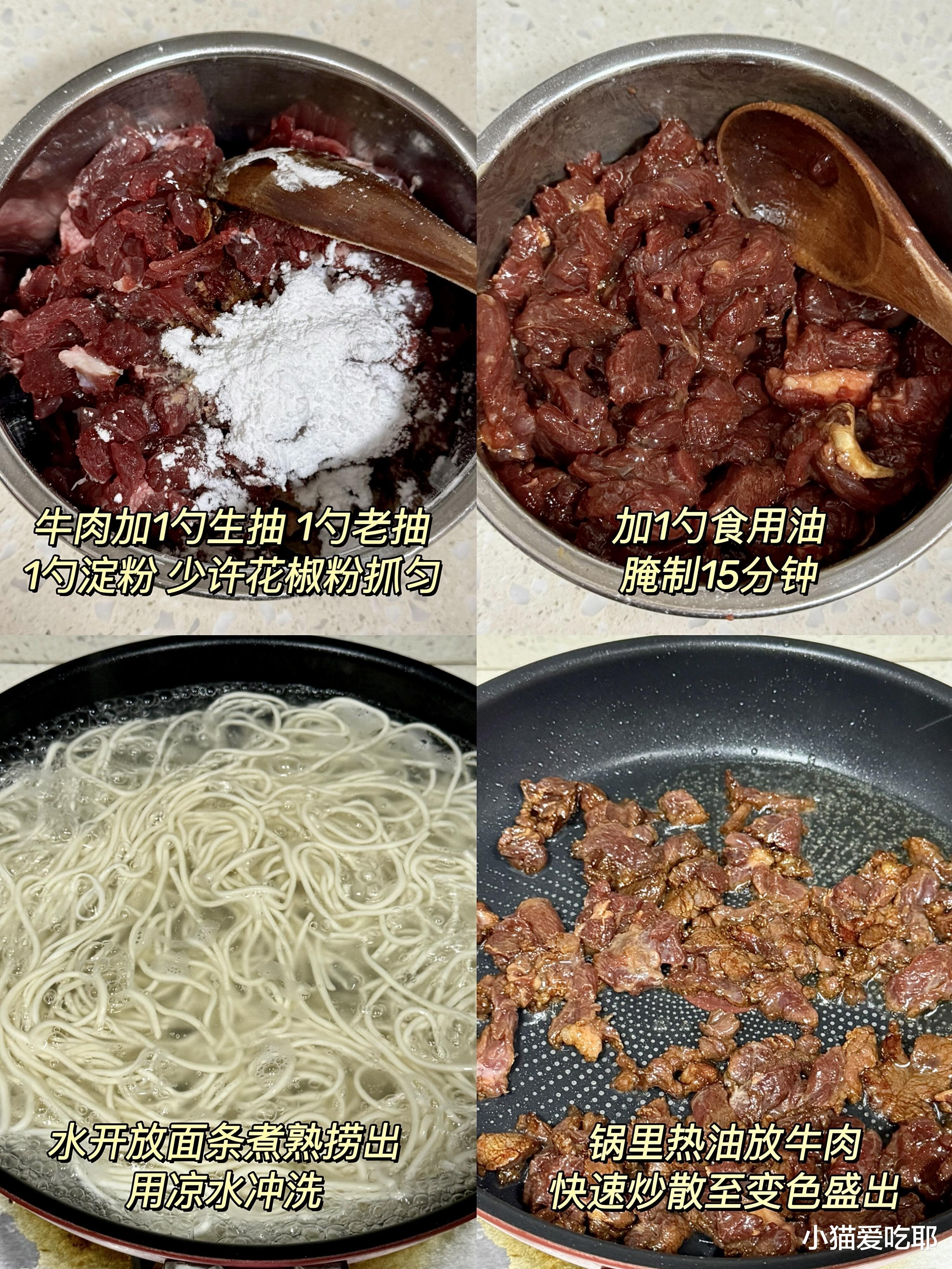 把之前炒好的牛肉倒回锅里,快速翻炒几下,让牛肉裹上豆瓣酱的香味。接着,把煮好的面条倒进去,用大火快速翻炒。加入一勺老抽、一勺蚝油和适量的盐,老抽主要是为了给面条上色,让面条看起来更有食欲。继续翻炒,让面条和牛肉充分吸收调料的味道。