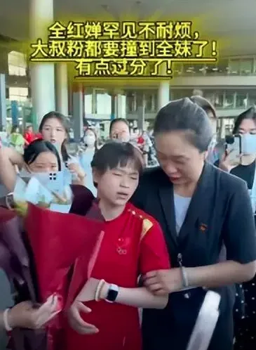 其中有个粉丝手里拿着鲜花,想送给全红婵,可婵宝没接。可能是有规定,或者太累了。