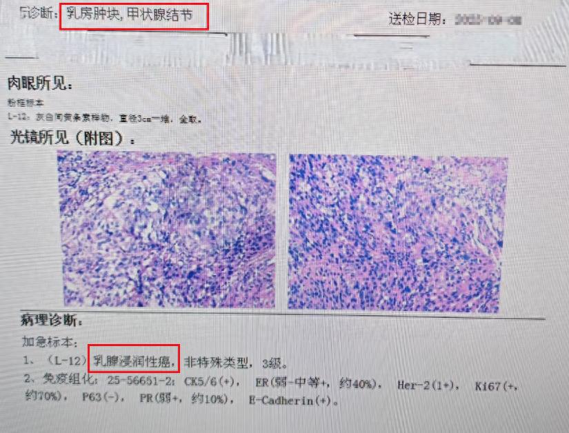 从首张报告的临床诊断来看,患者存在乳房肿块以及甲状腺结节的情况。这提示在关注乳腺问题的同时,也需要对甲状腺情况进行适当监测,不过当前重点还是乳腺病变。
