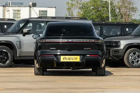 eπ007+整体造型延续简洁风格,车身姿态低宽,采用弓形溜背设计,视觉重心靠后,具有一定运动感。官方公布的风阻系数为0.209,据称通过23处空气动力学优化实现,包括主动闭合式格栅、平整底盘、流线后视镜及可升降电动尾翼等。这一风阻水平在同级别纯电轿车中处于较优位置,有助于提升高速续航效率。试驾车使用港湾蓝配色,在自然光下呈现蓝绿色调变化,质感较为特别。销售人员表示该颜色将在量产版中全系提供,不额外收费。前脸配备由104颗LED组成的星光棱镜大灯,点亮后辨识度较好,支持动态迎宾效果。纯电版配有主动闭合格栅,可根据车速和水温自动调节开闭状态,在保证散热效率的同时降低风阻。侧面采用无框车门和19英寸轮辋,强化了轿跑风格;后视镜集成蓝色指示灯,在L2+级辅助驾驶功能激活时亮起,提供直观的状态提示。车尾设有随速升降电动尾翼,车速超过80km/h时自动升起以增加下压力,提升高速稳定性,低速或停车时则自动收起,兼顾美观与能效。贯穿式尾灯支持锁车/解锁灯光秀,电动掀背尾门开口角度大、高度适中,便于日常装卸物品,尤其适合家庭用户搬运婴儿车、行李箱等大件物品。