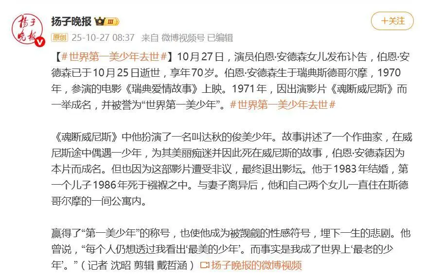 “威尼斯的阳光再照不到那个少年了。”10月27日,“世界第一美少年” 伯恩・安德森的女儿通过社交平台发布讣告,证实这位瑞典演员已于10月25日安详离世,享年70岁。无数网友翻出《魂断威尼斯》中他漫步沙滩的经典画面,在叹息中写下:“他用一辈子证明,被过度追捧的美貌,从来都不是礼物。”