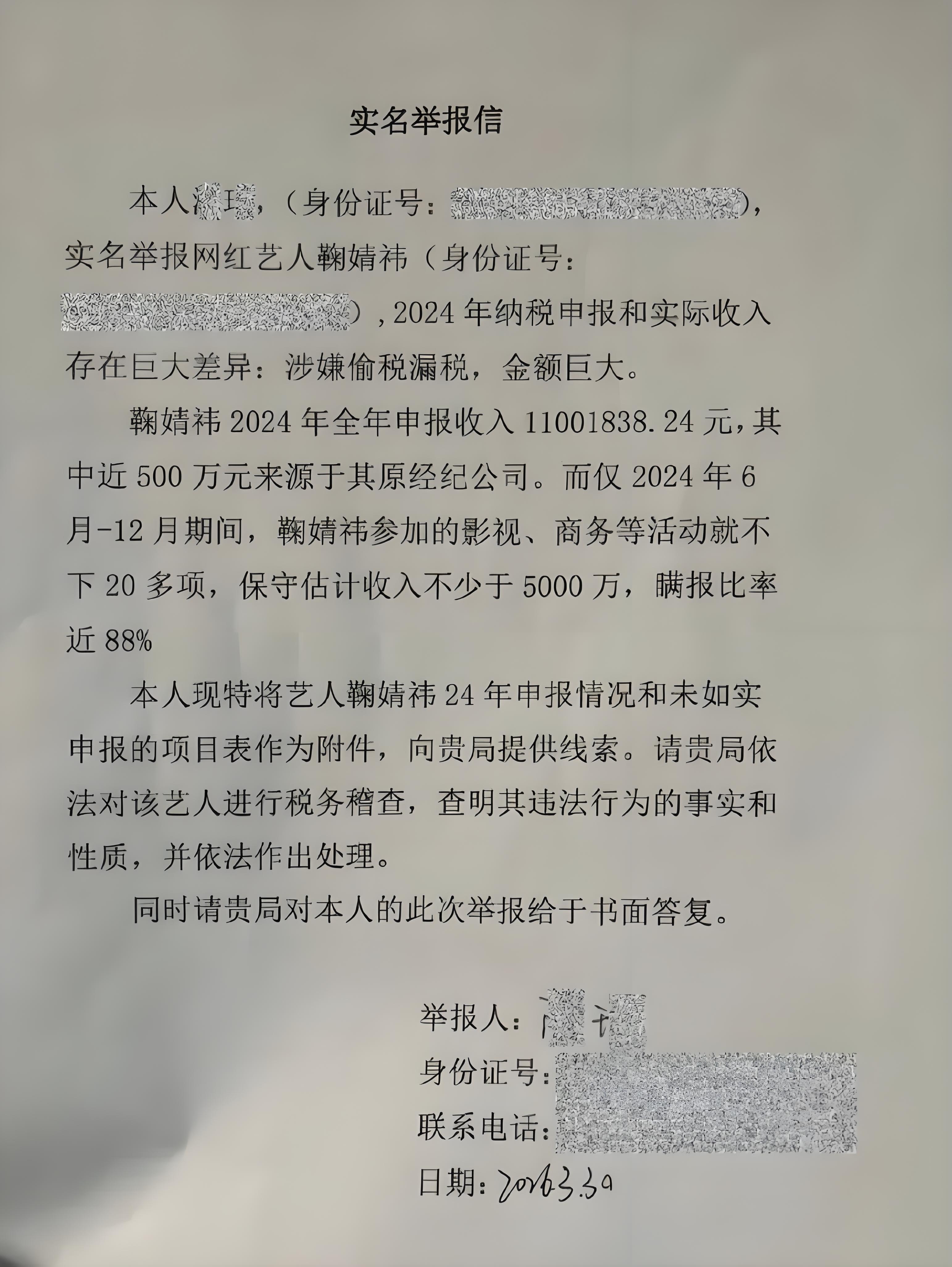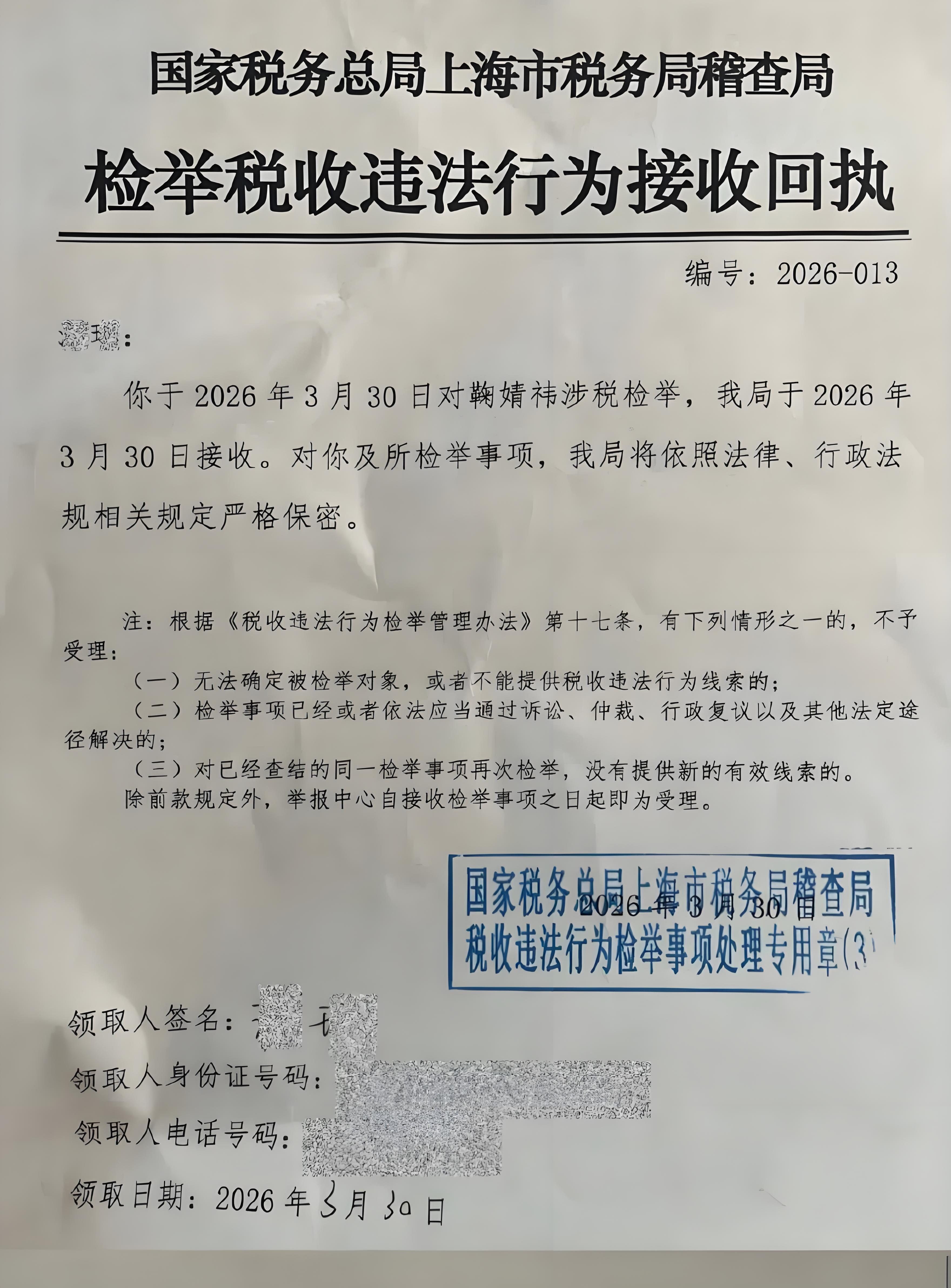 举报材料显示,鞠婧祎2024年自主申报收入约1100万元,而相关方核算其实际营收体量超过5000万元,二者之间的差额接近3900万元(以上数据均来自举报方材料,尚未经税务部门最终核实)。丝芭传媒向上海市税务局稽查局递交了全套举报资料,并对外公示了《检举税收违法行为接收回执》(编号:2026-013)。