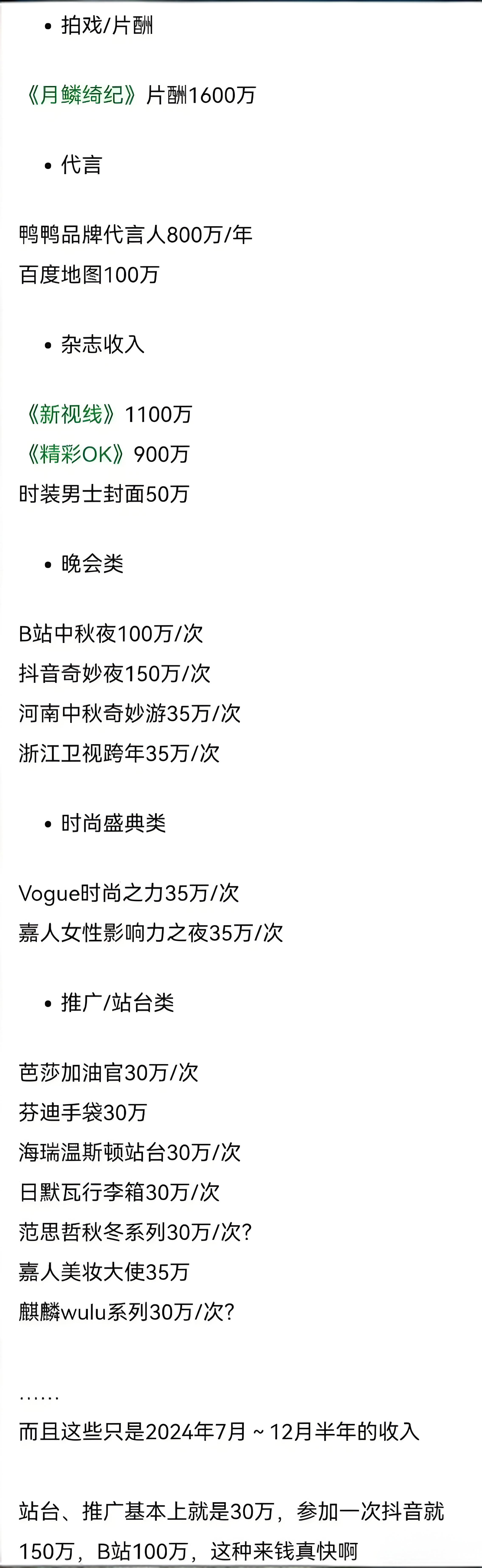《新视线Wonderland》《精彩OK》等杂志封面拍摄,合作收入分别标注1100万元和900万元;鸭鸭羽绒服年度代言合作标注800万元。
