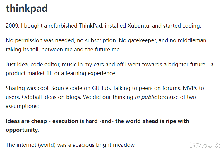 先回到2009年。我花了两千多块,买了一台翻新的ThinkPad。装上Xubuntu,然后就开始瞎折腾代码。那时候不需要问谁要许可,不需要交月费。没有守门人,没有中间商抽成。就一个想法,一个编辑器,耳机里放着歌,我就觉得自己能走向光明的未来。