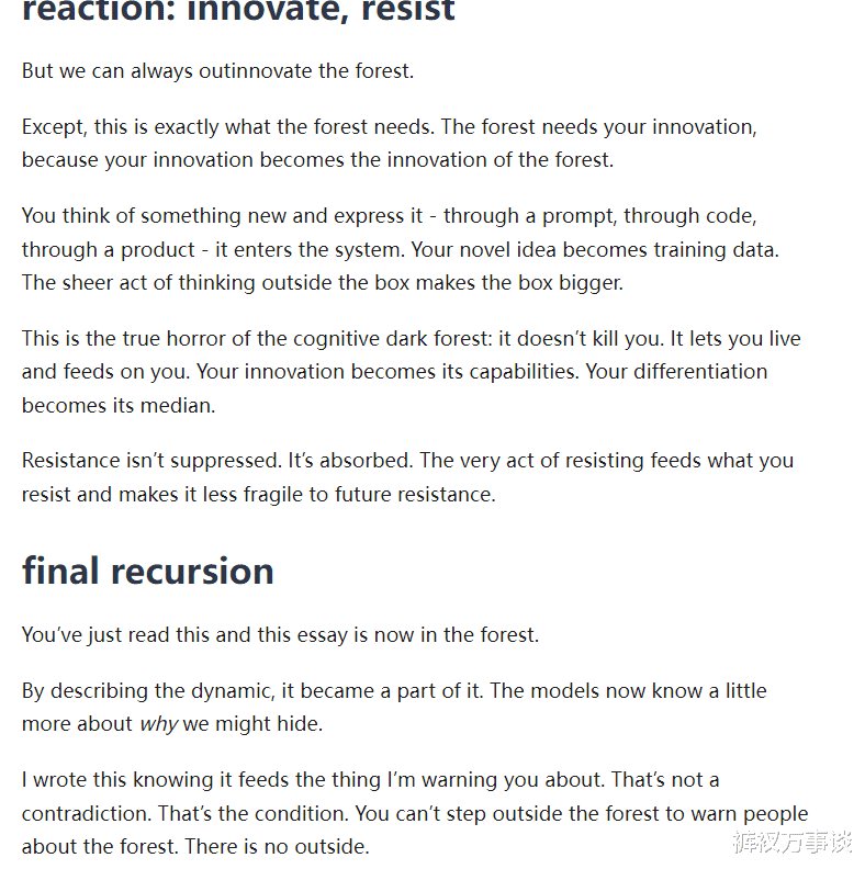 刘慈欣那个黑暗森林你们知道吧?宇宙里每个文明都躲着,因为谁暴露谁死。现在的认知黑暗森林更狠——杀你的不是其他文明,是森林本身。你有新想法,你忍不住表达出来,通过提示词、通过代码、通过一个产品,它就进了系统。你的创新变成训练数据,你的差异化变成它的平均水平。