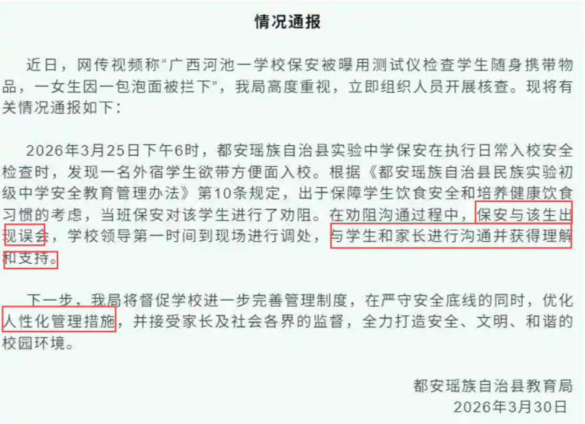 看到3月30日,大风新闻发的都安某中学那个保安搜身、学生鞠躬的视频,我没像网上那样第一时间跟着骂“学校黑心”。