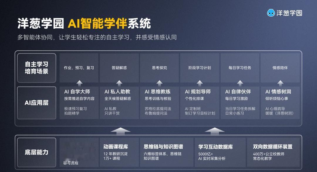 会上,洋葱学园正式发布全新的 AI智能学伴系统,通过“自学大师”、“私人助教”、“思维教练”、“规划导师”、“自律伙伴”与“情感树洞”等多智能体协同架构,搭建覆盖预习、作业、复习、答疑、思考、规划与情感支持的全场景自学培育体系,帮助学生实现轻松专注的自主学习,并感受情感认同。