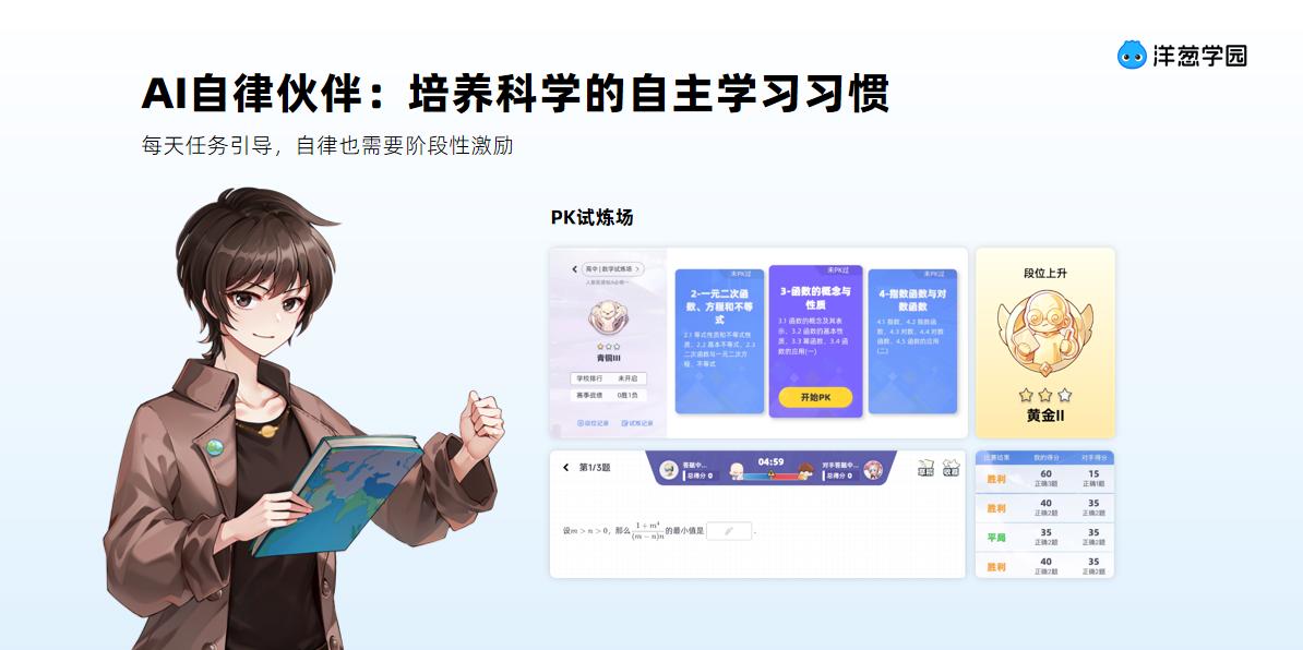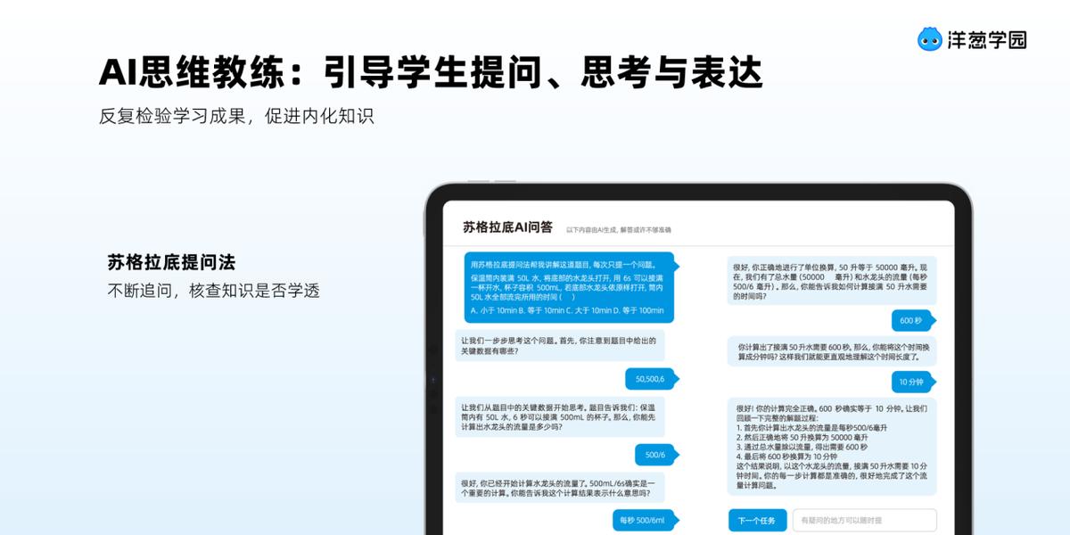 AI智能学伴进学校,建构系统化自学 学校作为“自主学习”培育的主战场,也是AI驱动教育变革的核心力量。通过深度协同合作,洋葱学园的AI智能学伴也已深入学校场景,重塑着课堂教学形态,培养会“自学”、会“提问”的学生。