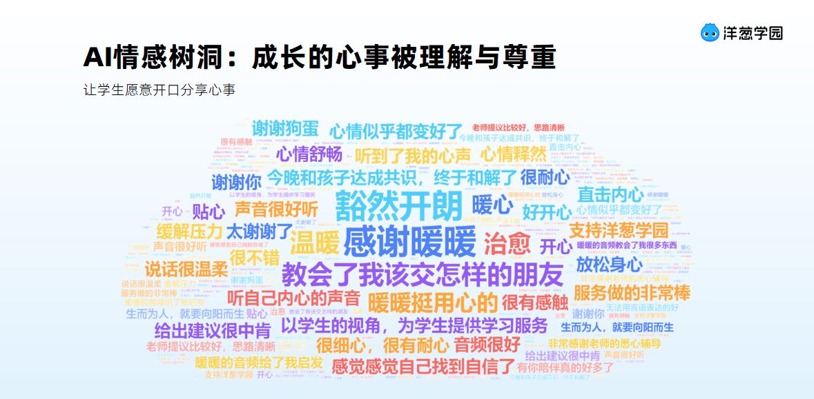 AI情感树洞即“洋葱树洞”,专注于学生在学习过程中的情绪变化,通过自然语言理解与情感识别技术,实时感知孤独、挫败、焦虑等情绪状态,并给予温暖、适时的回应与鼓励,成为学生可信赖的倾诉伙伴。