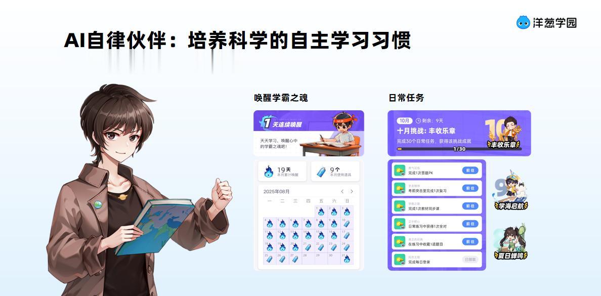 AI自律伙伴通过游戏化机制重塑学习体验,将重复性练习和长期任务转化为可进阶、有反馈的趣味挑战,如任务关卡、成就徽章与进度成长体系。这种设计有效降低启动门槛,提升专注时长,帮助学生在正向激励中建立学习节奏感。它不仅守护学习热情,更通过持续的行为引导,帮助学生逐步养成科学、可持续的自主学习习惯。