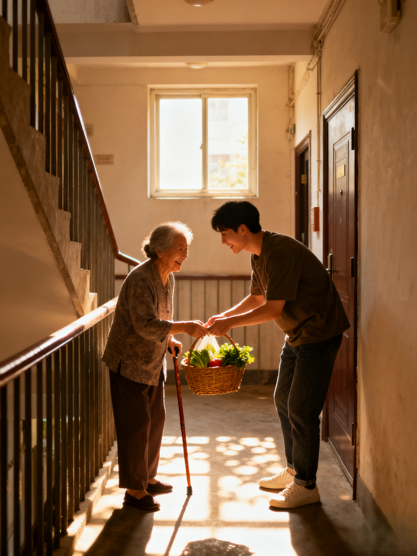 刚才下楼买咖啡,看见外卖小哥蹲在小区门口哭。原来他刚送完一单,发现车篮里多了袋橘子——是刚才那位独居老人硬塞给他的。老人说:“看你跑得满头汗,和我孙子一般大。”