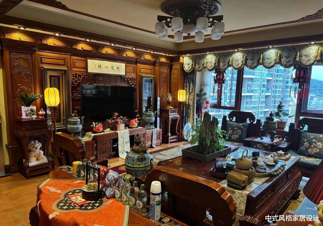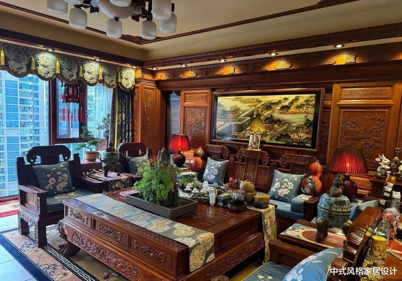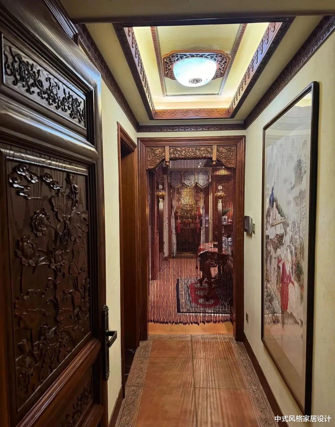 材质之魂:红木的生命力红木不仅是材质,更是这场中式盛宴的灵魂。在这平层空间中,精选的小叶紫檀、交趾黄檀等名贵红木,以各种形态展现着自然的馈赠。地面采用红木拼花工艺,形成回纹边饰与中心团花;墙面则以红木镶嵌玉石、螺钿,构成一幅幅寓意吉祥的图案。最令人惊叹的是那面整墙红木博古架,不仅展示了主人的收藏雅趣,更成为空间中的视觉焦点,其精湛的榫卯结构与细腻的雕刻工艺,令人叹为观止。这些红木家具与装饰,随着岁月流逝,颜色将愈发深沉,纹理愈加清晰,仿佛有了生命,记录着家庭的故事与时光的痕迹。